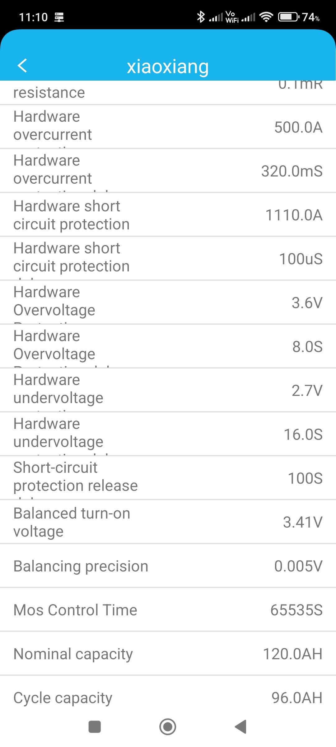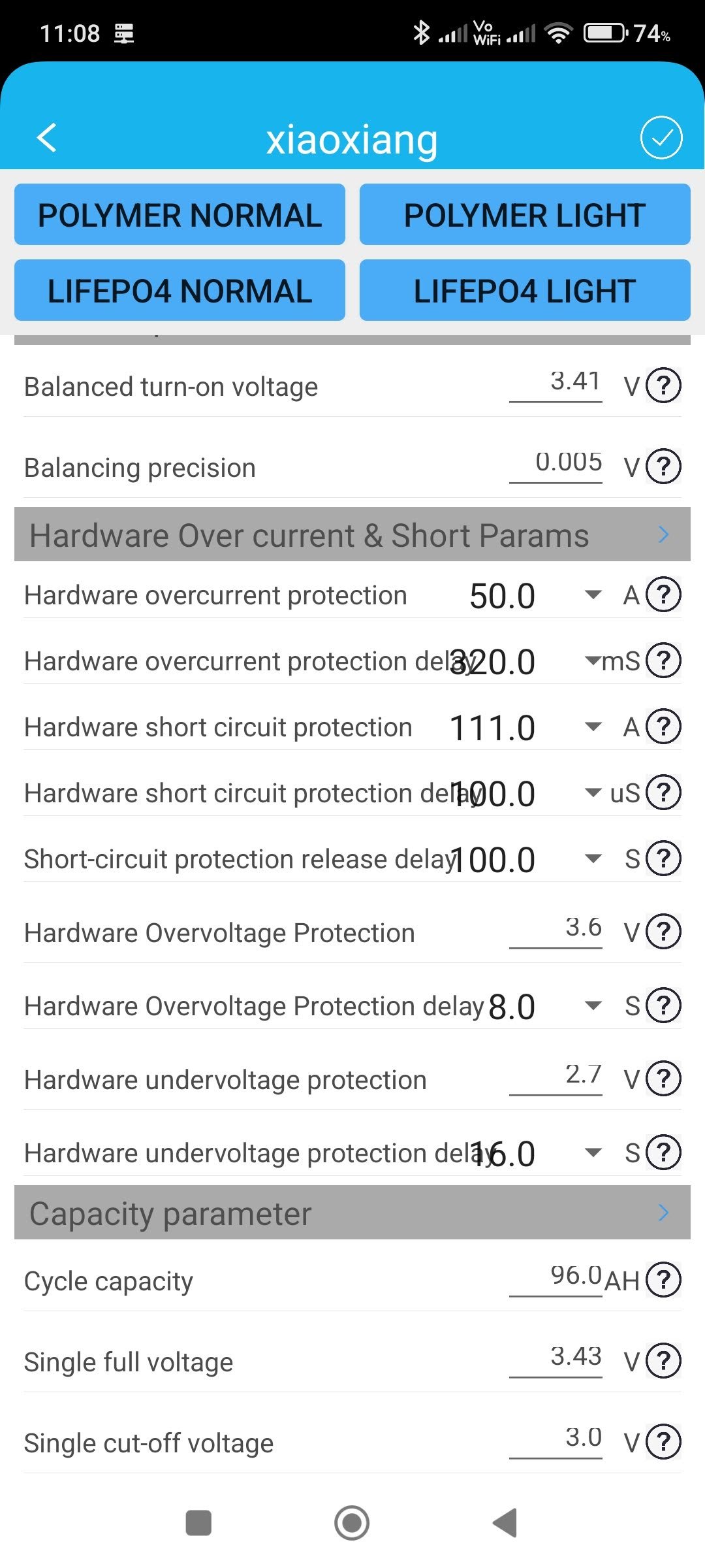 Když tam dá ty default hodnoty pro lifepo4 light tak by napětí mělo být 3.6V a 2.75V a při normal 3.65V a 2.5V (aspoň tak jsou ty hodnoty uloženy v mé BMS) samozřejmě si je můžeš nastavit jakkoliv, ale to nastavení lifepo4 light bude vždy lepší než co tam má teď takže upravit pro začátek kapacitu aby seděla a max proud + balancování je v default moc brzo s velkou chybou.