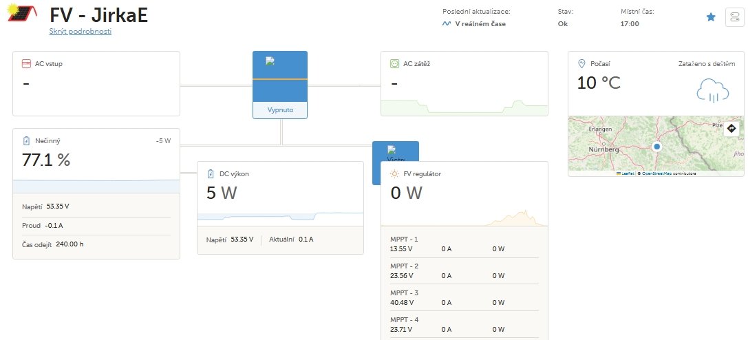 8,08kWp (V - 1,680kWp, J - 3,04kWp, Z - 3,36kWp), Victron MP2 5000VA, 2 * (Victron MPPT 250/85), 2 * ( LiFePo4 16x 280Ah Eve), Victron Smartshunte + BMS