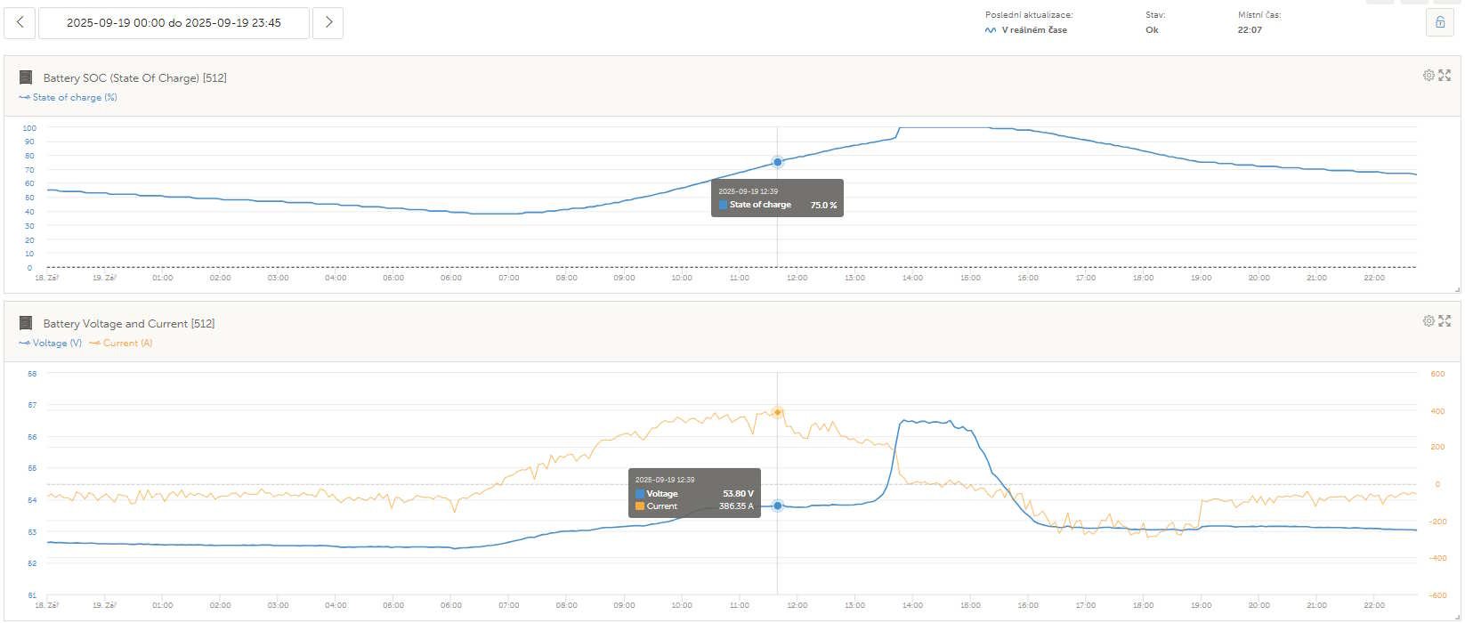Vybíjím do 15% SOC a do 20% SOC je připnuta síť. Krmí spotřebu a Multiplusy nabíjejí baterii min nastavitelným proudem 1A/ks