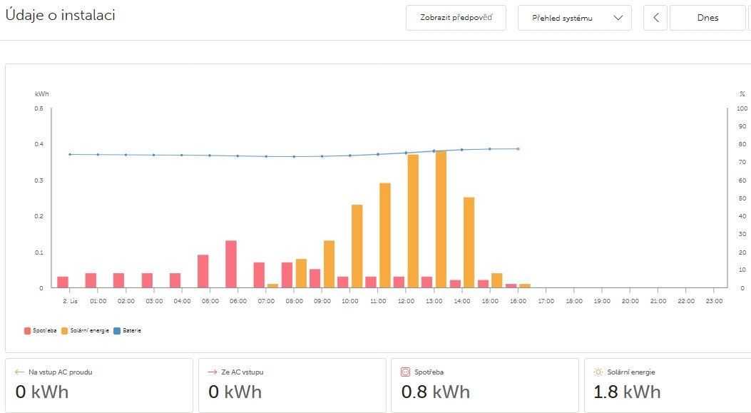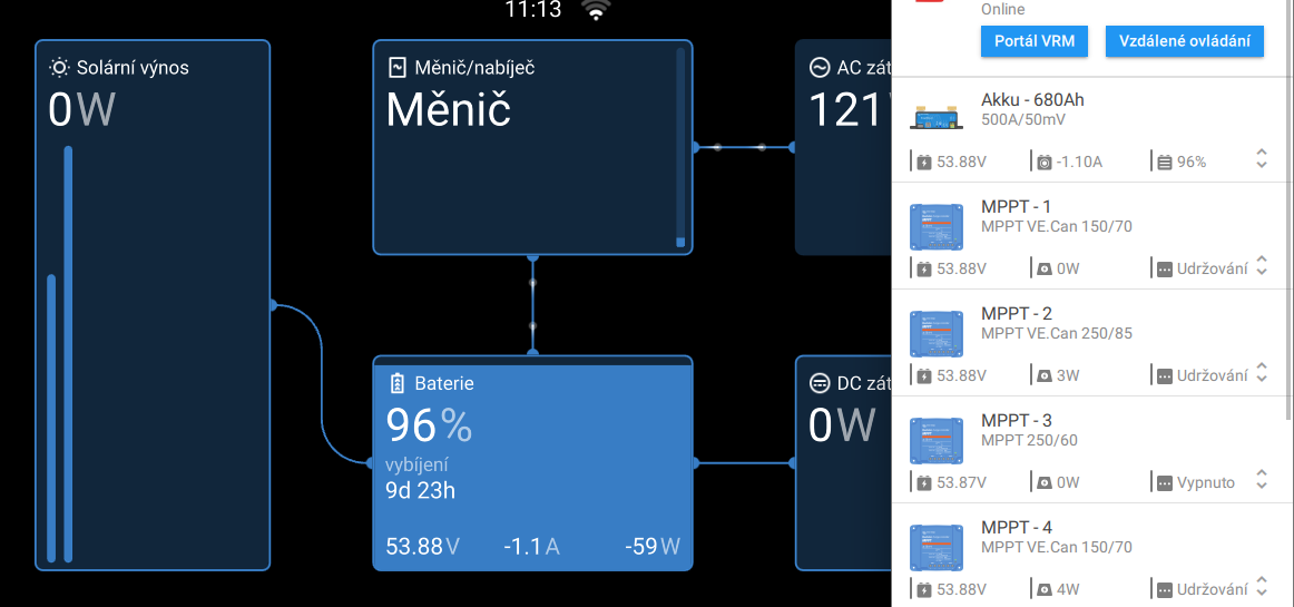 8,08kWp (V - 1,680kWp, J - 3,04kWp, Z - 3,36kWp), Victron MP2 5000VA, 2 * (Victron MPPT 250/85), 2 * ( LiFePo4 16x 280Ah Eve), Victron Smartshunte + BMS