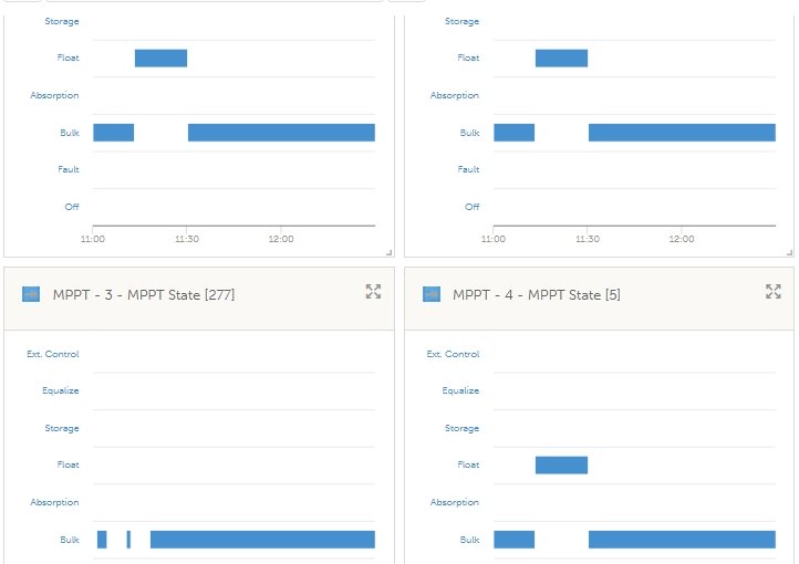 Nyní nechám DVCC zapnuté, ale vypnul jsem max nabíjecí napětí, mám podezření - že informace o napětí může být nekorektní při více MPPT a že to vypíná dřív než by mělo - což tak vypadá - jako kdyby nastavení každého MPPT nemělo vůbec vliv a stačí aby to ,,škrtlo" o nastavené napětí a spadne mě to režimu Flot - jako kdyby tam ta Absorce vůbec nastavená nebyla...