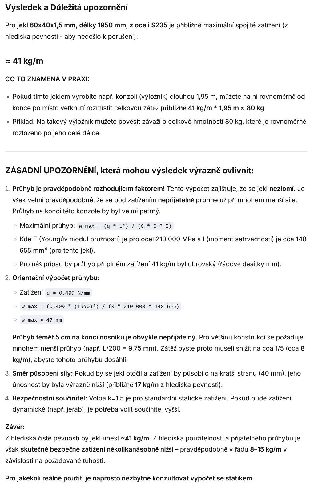 Spočítat? Měl bych to umět, ale dnes už je lepší nechat to spočítat AI a jen si projít její postup jestli je v pořádku. A některé věci - jako sílu větru musíš nějak odhadnout. DeepSeek dospěl na dotaz "Jaké spojité zatížení vydrží jednostranně vetknutý jekl 60x40x1,5mm délky 1950mm?" k tomuto: