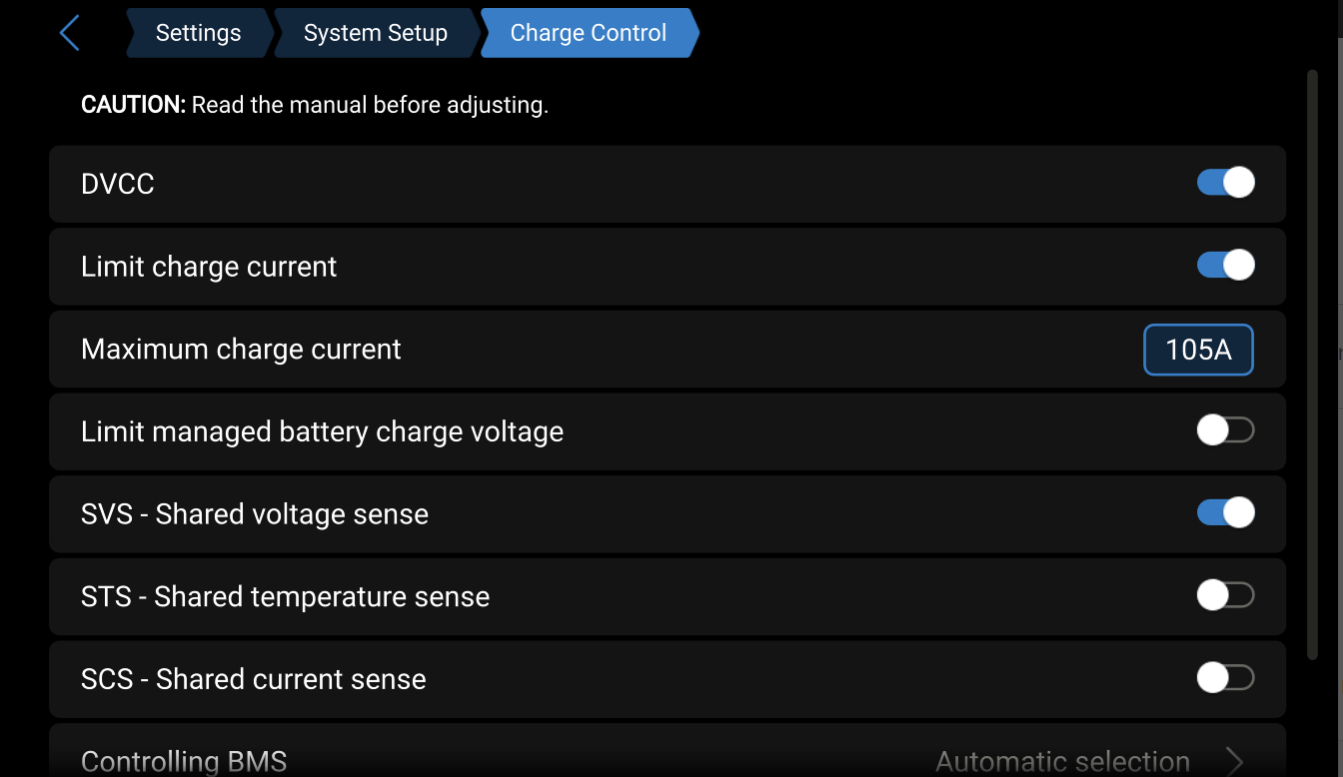 Managed CAN-bus batteries: In systems with a managed CAN-bus BMS battery connected, the GX device receives a Charge Voltage Limit (CVL), Charge Current Limit (CCL) and Discharge Current Limit (DCL) from that battery and relays that to the connected inverter/chargers, solar chargers and Orion XS. These then disable their internal charging algorithms and simply do what they're told by the battery.