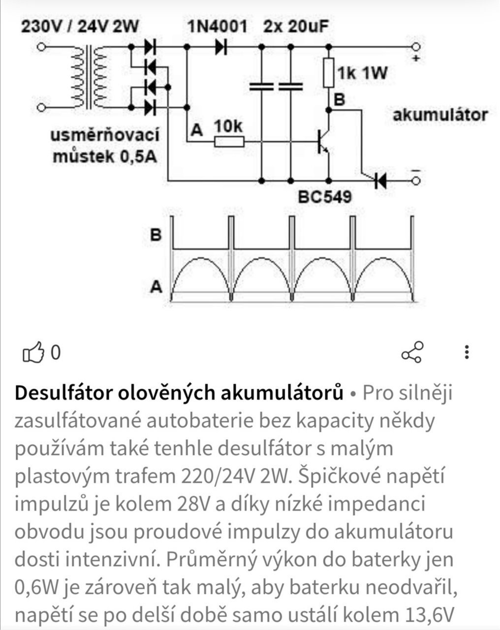Ideální je mít zdroj střídavého napětí, tedy transformátor, s výstupem třeba 15V Uef, za ten připojit jednu dostatečně výkonnou diodu, aby vznikl jednocestný usměrňovač, z něhož poleze pulzující proud a desulfovat a zároveň nabíjet tu baterii tím pulzujícím proudem.