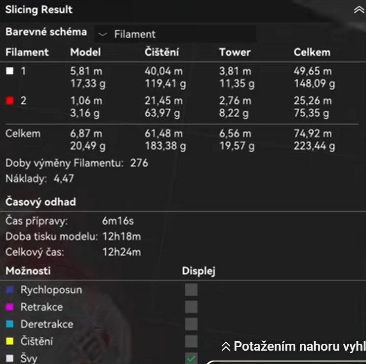 Ve volných chvílích koukám na základy 3D tisku a zaujala mě spotřeba filamentu při dvoubarevném tisku. 6,87m na tisk, 74,92m odpad.