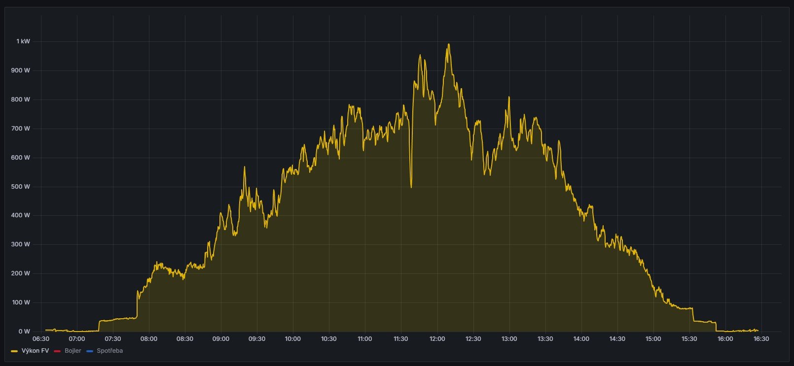 No dnes hnus.Z pole 4500Wp výroba 1kWh.Mám 6 témĕř stejných polí. Celkem 6kWh.