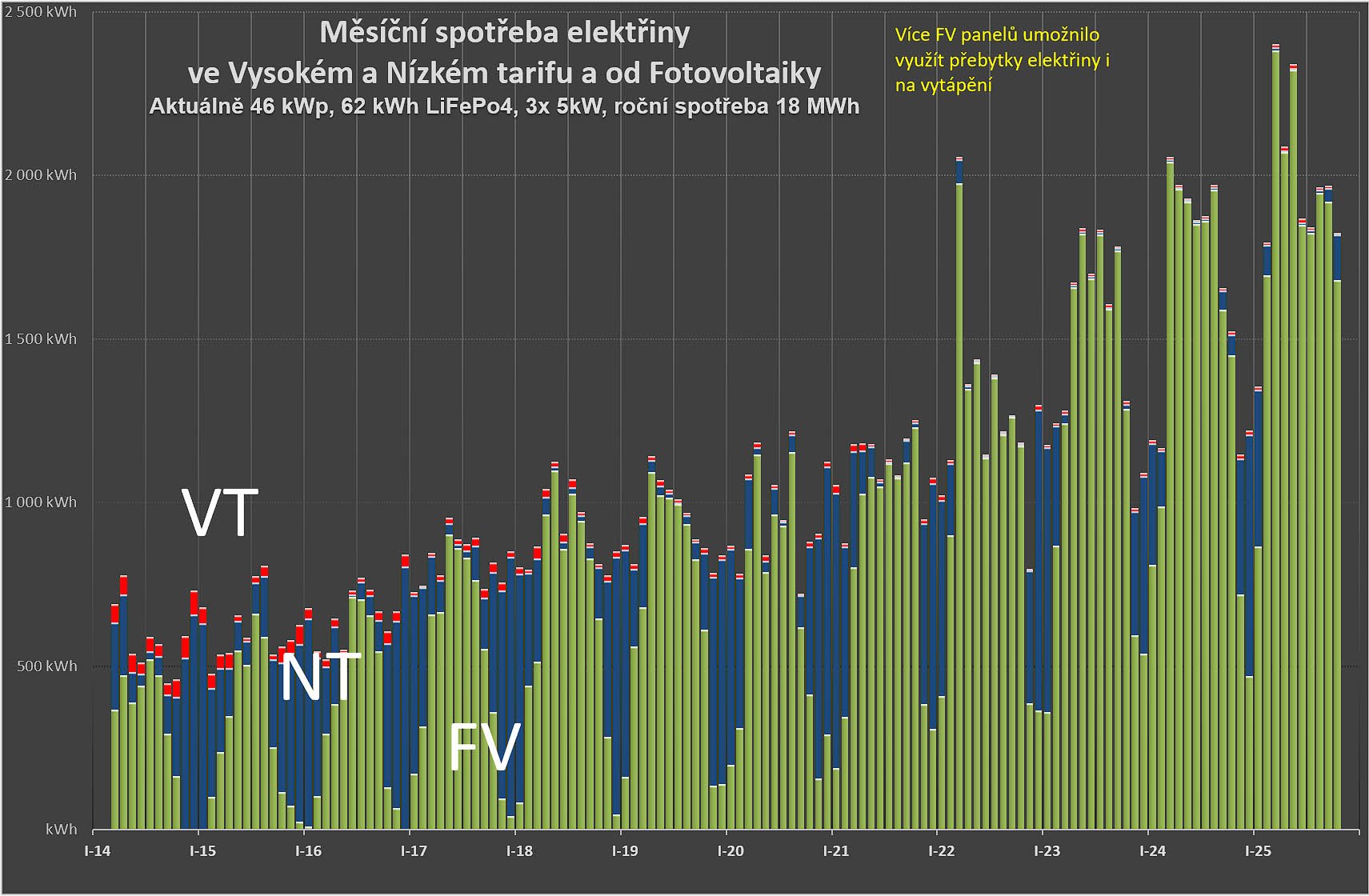 Hm, upřímně tomu úplně nerozumím. 62kWh baterie je půl milionu - kde je ta úspora, když se uměle zvyšuje spotřeba energie, aby se ta vyrobená spotřebovala? Nic osobního, jen jsem to možná blbě pochopil. Ale tahle cesta mě neláká - hledám levné smysluplné řešení na stávající stav. Navíc mám opravdu omezenou střechu na 12 panelů a více jich neplánuji. Ale díky moc, všechny zkušenosti jsou důležité.rva píše: pon lis 10, 2025 3:40 pmPodívej se na měsíční spotřebu elektřiny za posledních 10 let: