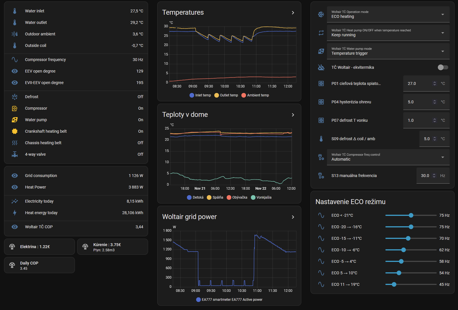 PWM na obehové čerpadlo zatiaľ neriešim, ale už mám prietokomer, tak vidím COP pri kúrení a viem si spočítať aj "denný COP", porovnať prevádzku TČ vs plyn prepočítaný na kWh dodané cez TČ.