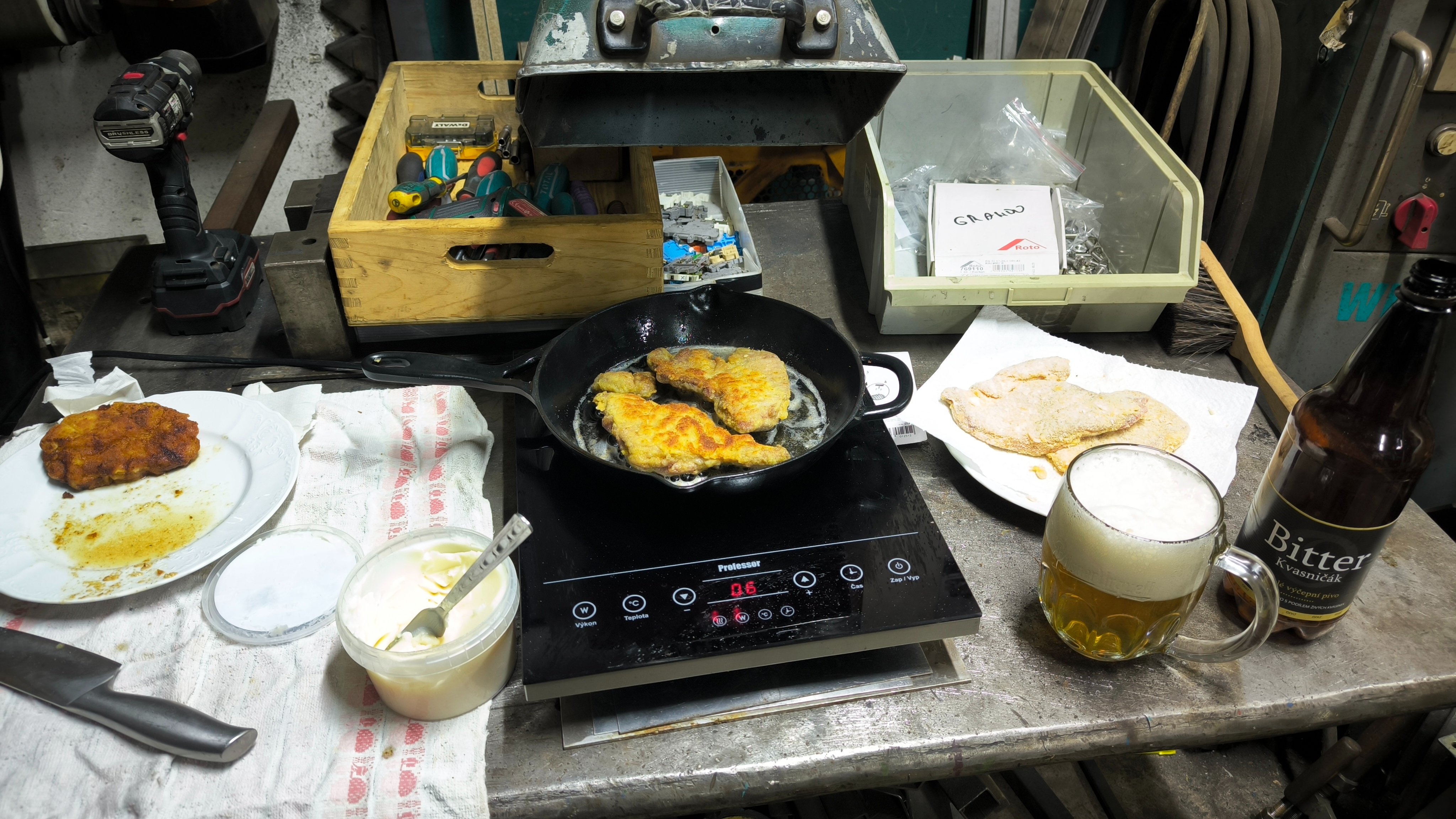 ještě nemám dodělaný AC rozvody, tak jsem natáhl prodlužku do dílny a hned budou chutnat líp, když je el. zadarmo