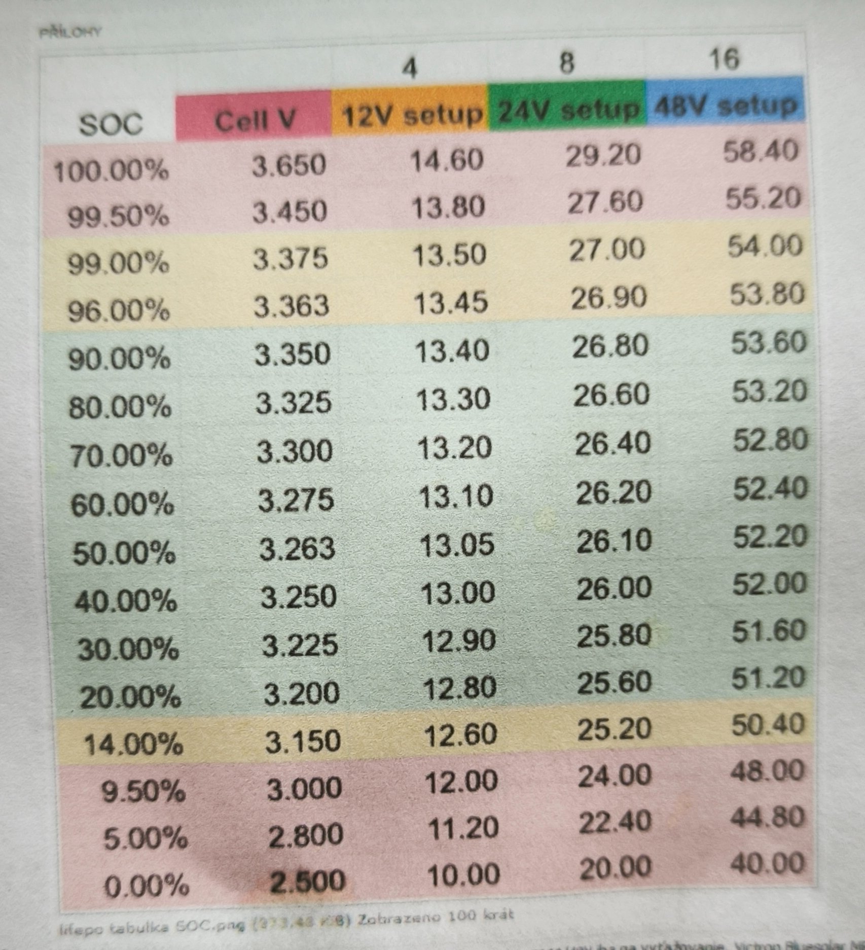 To je tabulka napětí LiFepo4 článků bez zátěže