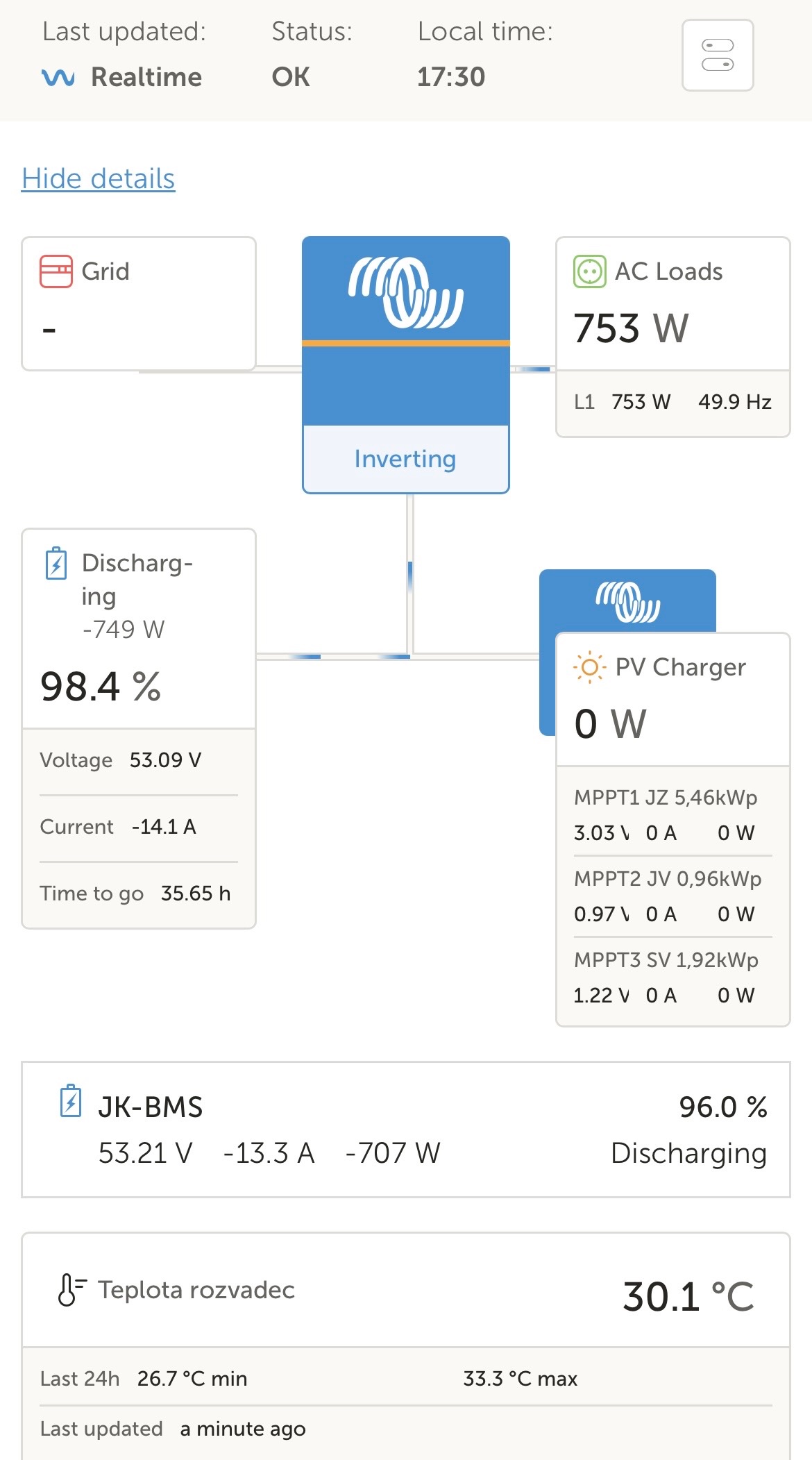 ostrov skoro 8kWp neustále ve stádiu zrodu: smartshunt(ex WBJR), MPPT150/45, MPPT 250/100(ex midnitesolar 150 clasic lite), 16S a různě P cca 340Ah Winston, MP II 5000,( ex Powerjack 8kW, ex samodomo cca 4kW). 48V DC rozvody a spotřebiče.