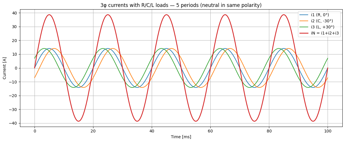 Podle mě kdybych nějakým zběsilým kondenzátorovým/indukčním zařízením posunul jednotlivé do té nejnepříznivější pozice, tak by vodičem N mohl teoreticky téct sumární proud za všechny 3 fáze.