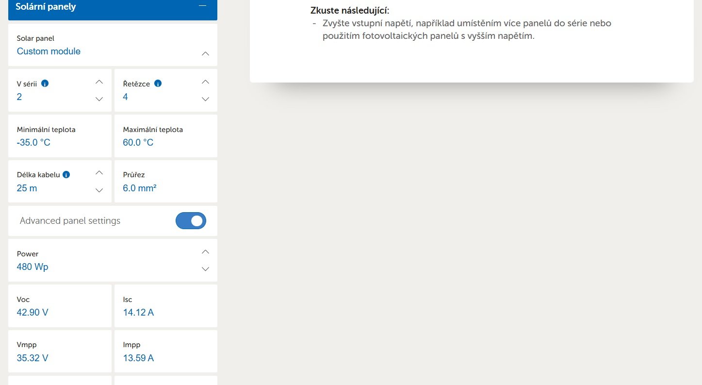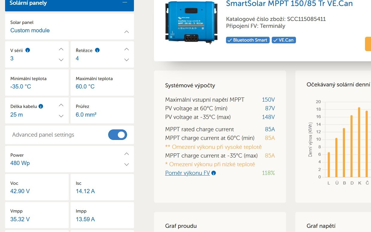 Bude to 15 stringu 2S (14,4kWp) takze myslim ze ty ztraty budou v pohode. Kdyz uz se to dela nove proste bych rad dodrzel tech 120V i za cenu 500m kabeluglottis píše: pon pro 22, 2025 8:59 amProc by to nefungovalo. Fungovat to bude, jen budou vetsi ztraty. Myslim ze to bude v pohode