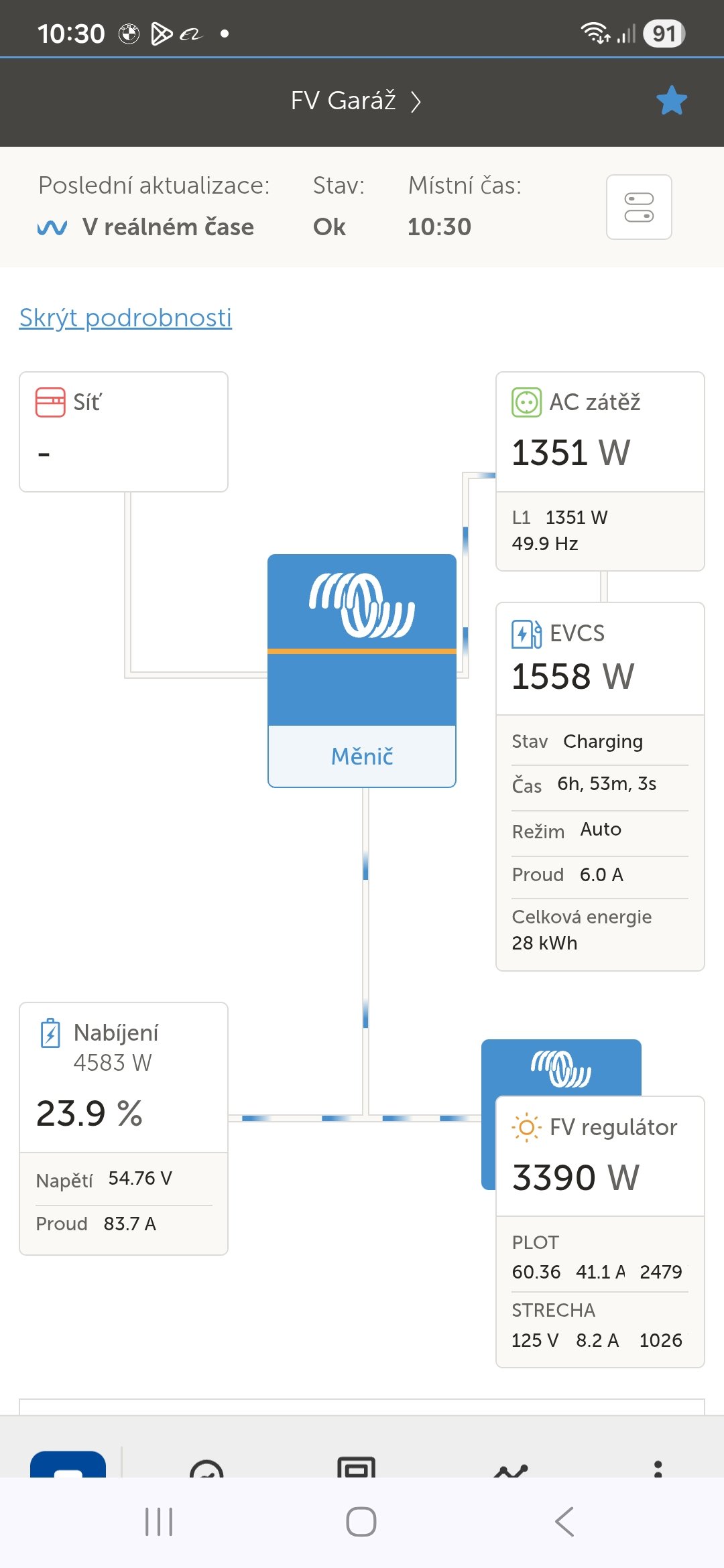 Zkusil jsem jít cestou módu střídačů "CHARGER ONLY", to by mělo něco ušetřit. Ale 2x mi spadnul systém. Možná spadlo Cerbo (prodleva 1400 ms v době pádu) a s ním systém, tak tam nyní optimalizuju své programy a uvidím v další době termna. Zítra by už mělo svítit i u nás.