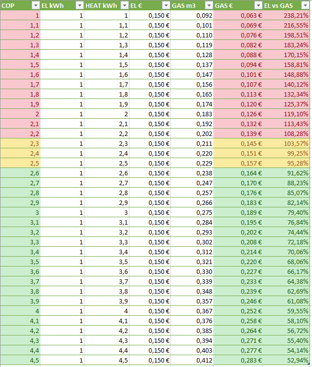 A ešte jedna zaujímavá tabuľka o porovnaní plynu a TČ podľa COP, kedy je výhodné kúriť s TČ a kedy plynom. Pri mojich cenách (0.15€ elektrina, 0.687€ plyn m3) sa to láme pri COP 2.4 . Pri -5°C je to u mňa ešte stále okolo 2.5, takže idem stále na TČ. Samotné kúrenie má o niečo vyššie COP, denný priemer "kazí" ohrev kompresora a šasi pri mínusových teplotách. No a samozrejme deforst keď treba. Uvidím keď ešte prituhne, kam to až spadne. A druhá vec, keď konečne zapojím TÚV na TČ