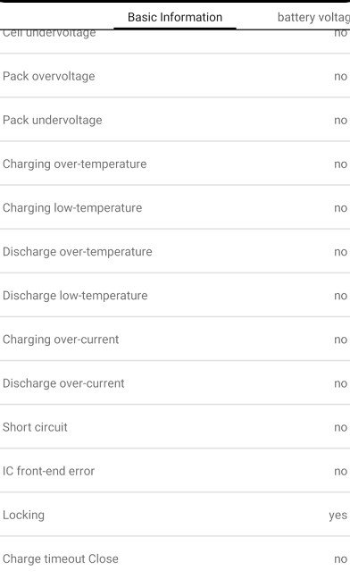 Na základní obrazovce je myslím problém údaj discharge:off a Protection Locking. Jednotlivé články se jeví OK Discharge switch off - asi by mělo být on - jak nastavit? Locking yes - asi by mělo být no, nevím jak nastavit.... Vůbec netuším co s tím....