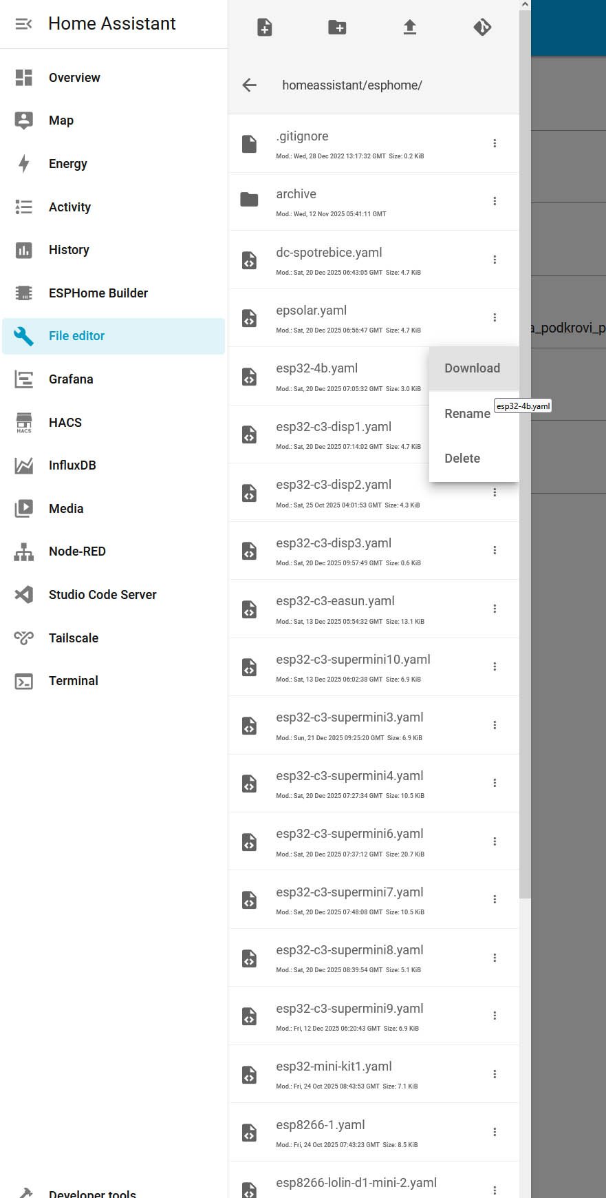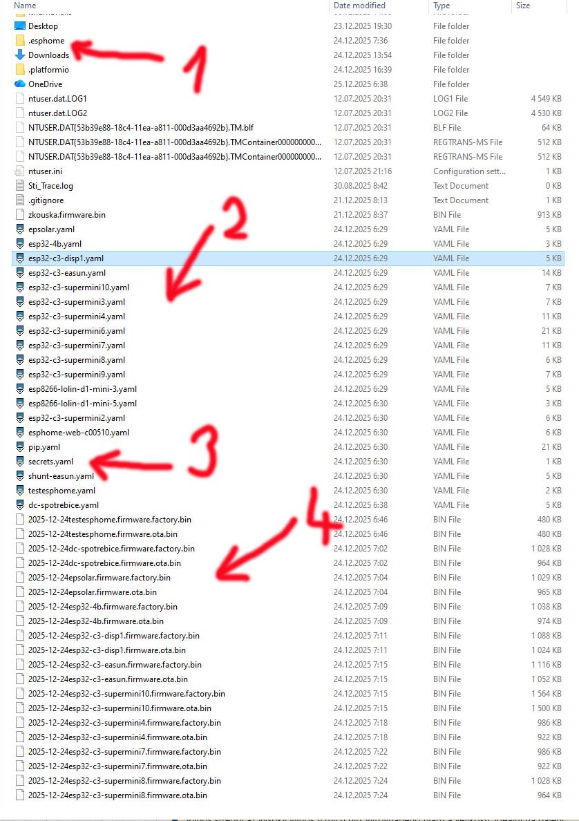2. Soubory *.yaml pro všechna ESP zařízení si stáhnu z HA do PC: 3. Soubory yaml (2) přesunu do složky, ve které mám nainstalováno .esphome (1): 4. Nezapomenu tam přemístit i stažený soubor secret.yaml (3) s hesly pro wifi, která bych jinak musel psát do každého yaml.