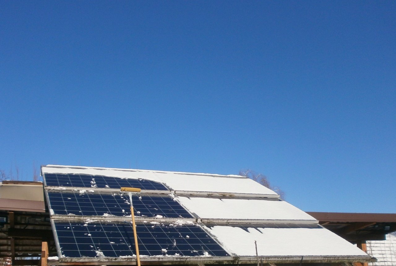 V predvečer Silvestra napadol prvý sneh tejto zimy a posledný tohto roka. Už predtým mrzlo, takže celkom pohoda večerná prechádzka. Ráno sa začalo ukazovať slniečko, tak dávalo zmysel omiesť panely. Všetkých dvanásť dočiahnem zo zeme predĺženým ožehom, takže bezpečne. A trvalo to 15 minút.