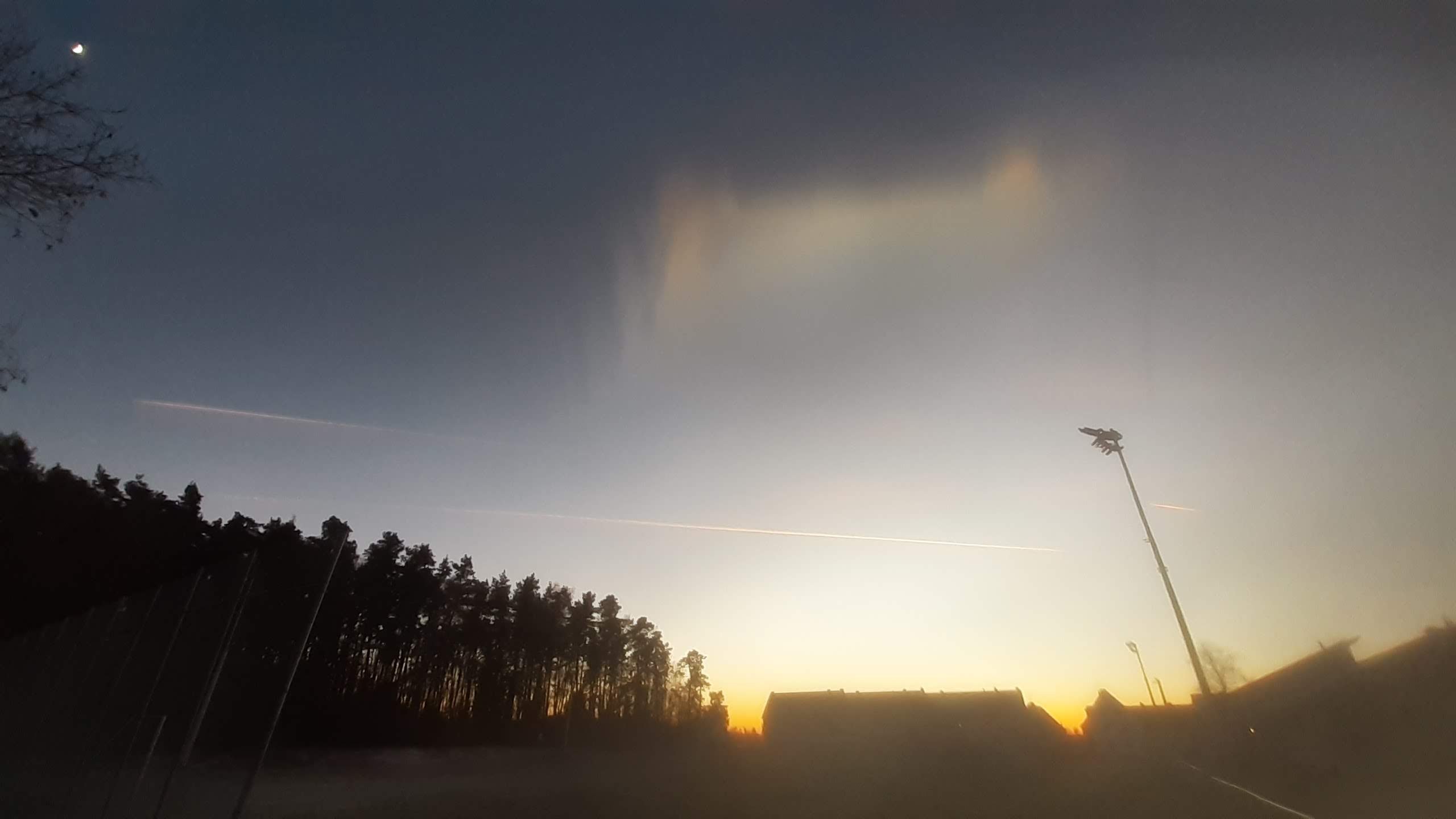 To není mrak, nebe úplně čisté - ale pojmenovat to neumím, asi optický klam a náhoda způsobená sluncem ze západu...