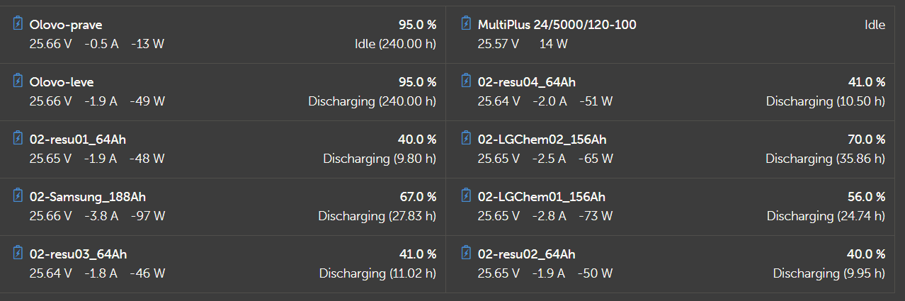 2x MUST PH1800 5.5kW, 9kWp V+J+Z, 600 Ah LiFePO4 s BMS JBD 200A, SW: Home Assistant na Synology DS923+ ku tomu ESPHome, Tasmota, MariaDB, InfluxDB, Telegraf, Grafana, Zigbee2MQTT..., HW: ESPlan (ESP32 + LAN 8720 + RS485). Nejaké moje projekty: MUST-ESPhome, ELTEK Flatpack2 ESPhome, ESP32-EMON, PZEM-017@WiFi, diyBMS-CurrentShunt-ESPhome , BMS UART-TS485 adaptér
