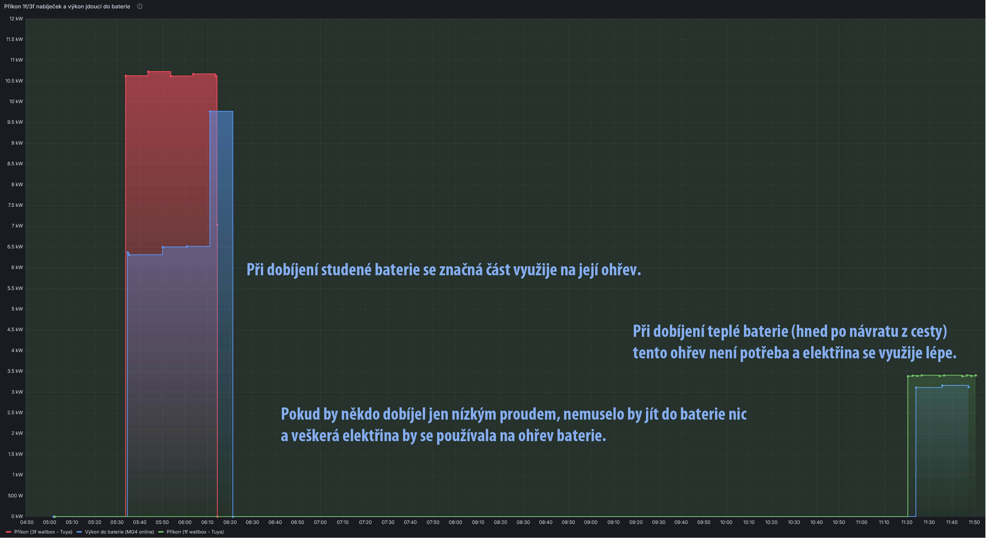 Jen ukázka, jak záludné je dobíjení elektromobilu MG4 (a jinde to nebude jiné) za mrazu. Pokud by někdo chtěl došťouchávat z fotovoltaiky třeba jen 1f/ 230 V / 3 A, tak se může stát, že do baterie nepoteče nic a vše se spotřebuje na ohřev baterie. Proto je lepší dobíjet hned po návratu z cesty, kdy je baterie ohřátá a vyššími proudy, aby se baterie nemusela ohřívat dlouhé hodiny.