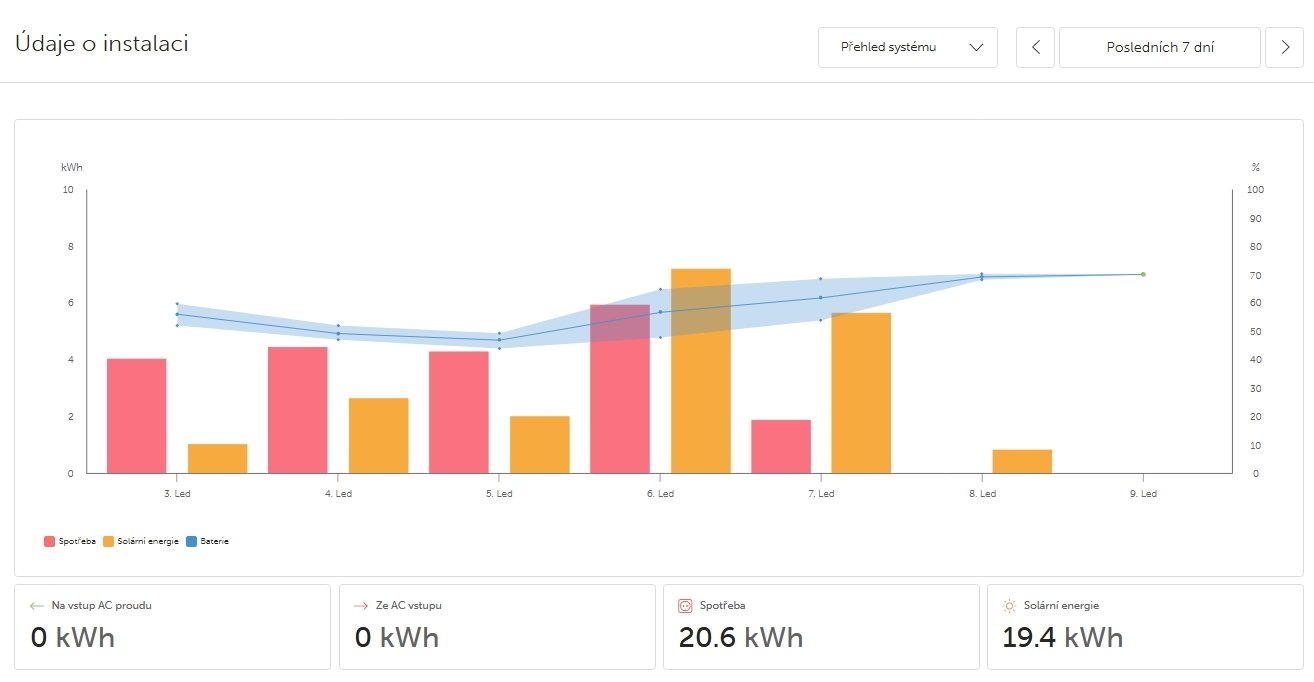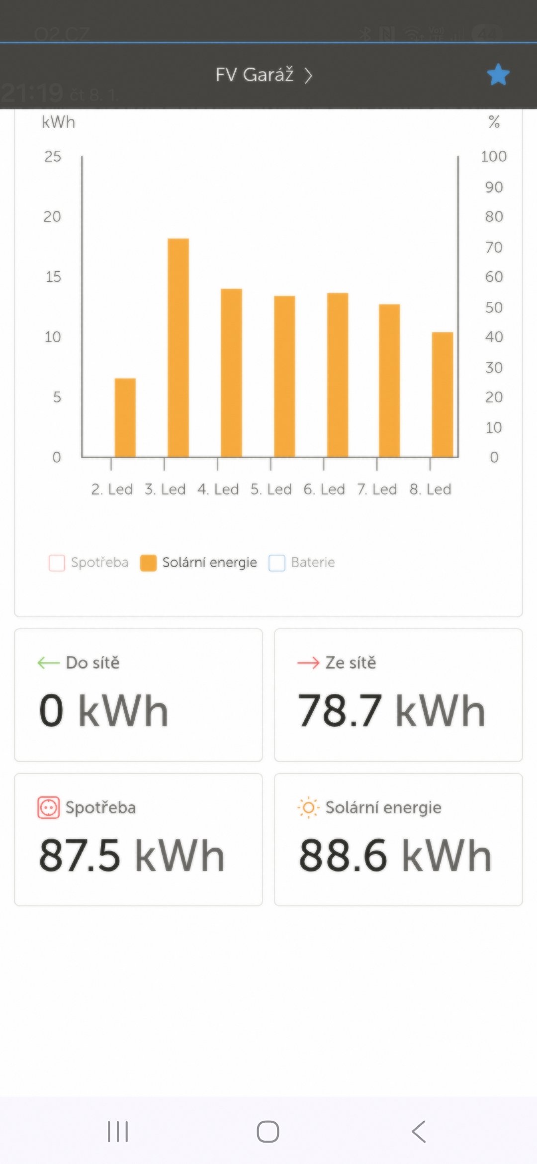 Já mám za poslední týden výrobu okolo 180kWh plná sobĕstačnost i do auta nĕco zbylo.Bliži se konec topné sezony dřevem.Toto.je polovina el.