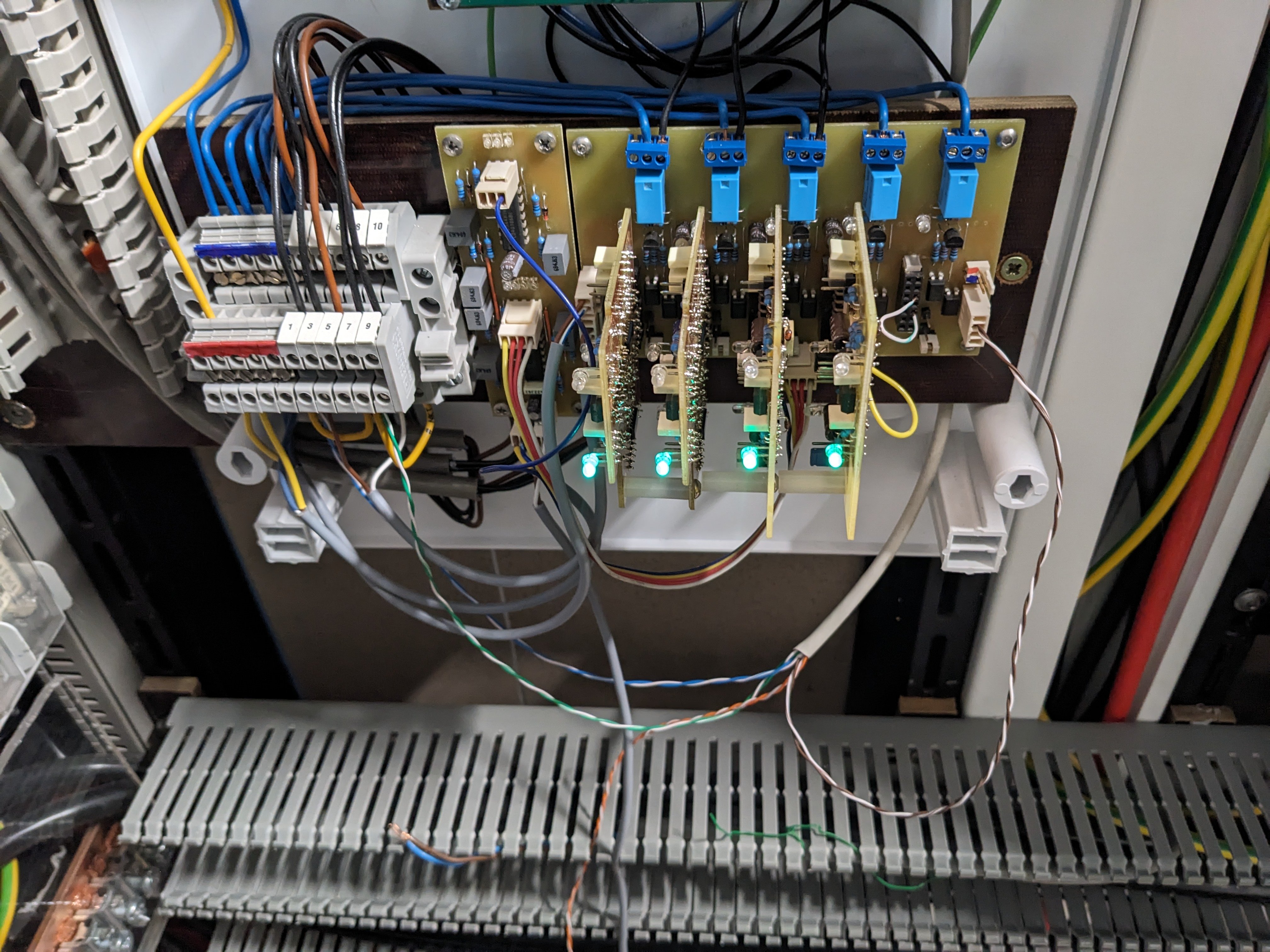 Pak mám desku s až 5 nezávislými časovači, které při signálu "nahoru" postupně spínají jednotlivé výstupy, na kterých jsou pověšeny stykače. Při signálu "dolů" se zase od posledního sepnutého postupně vypínají. Časy mohu nastavit pro směr nahoru i dolů nezávisle v krocích cca 20, 40, 80s, nebo trojnásobek, tj. 60, 120, 240s. Je to všechno analog, pomocí časovačů 4060.
