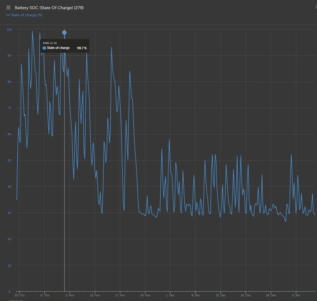 SoC neřeším. Při poklesu na 30% si Cerbo přes relé spuštění generátoru zapne stykačem napětí ze sítě na AC in, proudový limit vstupu mám 2x6A, při větší zátěži dělají střídače jen peak shaving. Když SoC přeleze 35%, stykač si Cerbo vypne. V průběhu roku si to žije vlastním životem, při slunečném dni cca od března do září se baterka plně nabije téměř každý den, těch 16kWp na střechách něco vyrobí, dalších 11 čeká v garáži. Naposledy byla nabitá 1.11., ale reset SoC na 100% neproběhl. Zatím se drží, tak uvidíme.