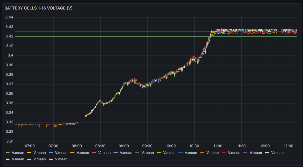 To je mylný předpoklad, pokud jsou po hodině v absorbcí články tak srovnané, neteče do baterie nic nebo malá drcnuti proudu v řádu destin A po krátký čas. Neteče tam skoro nic. Ta baterie je z pohledu absolutní kapacity téměř plná.Whoat píše: úte led 06, 2026 10:48 amTak ono to dává smysl. Do baterek něco cpeš, takže se zvedne napětí okamžitě.