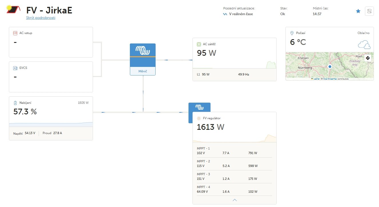 100% OSTROV SČ KRAJ = 16 panelů Canadian Solar CS3K-305; 2 větve 2S4P; 2x Regulátor Victron BlueSolar Charger MPPT 150/60; Měnič 1F Smart Phoenix Inverter 48V 5000VA 230V; Monitoring Victron BMV700 + Raspberry Pi 4B; Energy Meter ET112 a spousta kabelů.