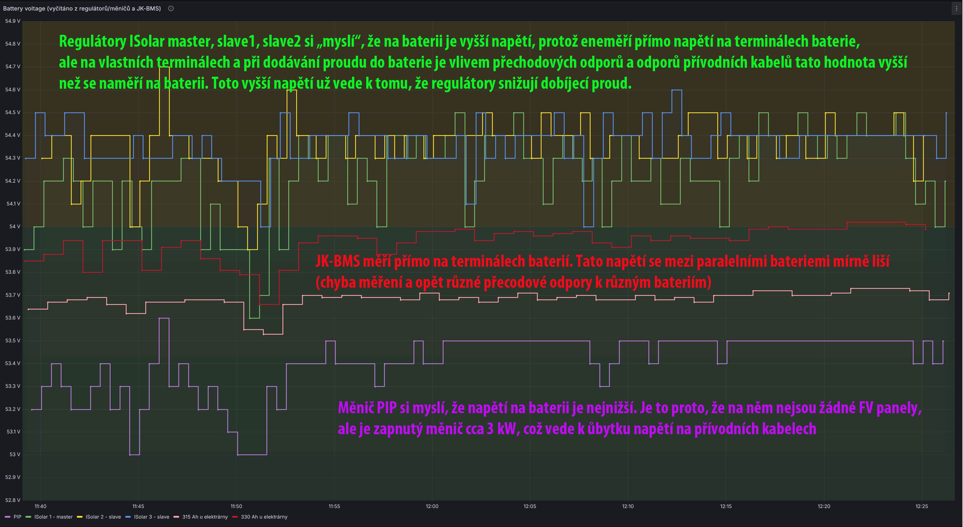 V momentě kdy má člověk více střídačů připojených k jedné baterii přestává to doslova být prdel. Protože takovýto systém bez komunikace se může kaskádově rozsypat jako domeček z karet. Pokud mi ze 3 střídačů může téct do baterie 300A a mám tam 4x100A limit na BMS může se to posrat velice rychle... ten proud do baterek totiž vůbec nemusí jít rovnoměrně jelikož lifepo4 je velice tvrdé a má v 40-80% SOC i velmi malý rozdíl v napětí článků opravdu mohou baterky paralelně spojené od sebe být klidně 30% v různém stavu nabití. Potom když dojde k dosažení napětí kde začíná napětí na baterce stoupat baterie najednou jakoby přestane odebírat proud a proud poteče do baterek vybitých. Takhle se dotáhnout postupně všechny baterky a najednou to dojde do stavu že všechny baterky jsou nabité a veškerý proud teče do poslední baterie a tam logicky začne bms baterku odpojovat na nadproud, v momentě kdy ji odpojí se ostatní baterky dostanou napětím výš, na to zareaguje mppt a stáhne nabíjecí proud, napětí klesne, odpojená baterka se připojí a cyklus se opakuje. Takle prosím ne... toto je velmi nebezpečné!