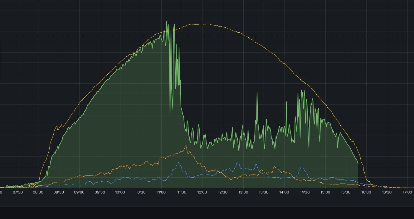 Dneska jeden z nejhorších nesouladů estimace a reality. Solcast se ještě teď holedbá, že jsem dneska měl nasosat 20 kWh, takže jsem včera lehkovážně i přitápěl elektrikou (mám jen D02d !), jakože dneska to dotáhnu, a v reálu jsem s odřenýma ušima natáhl 7 kWh, takže se třepu někde na 45% baterky, jestli vůbec vydržím do rána.