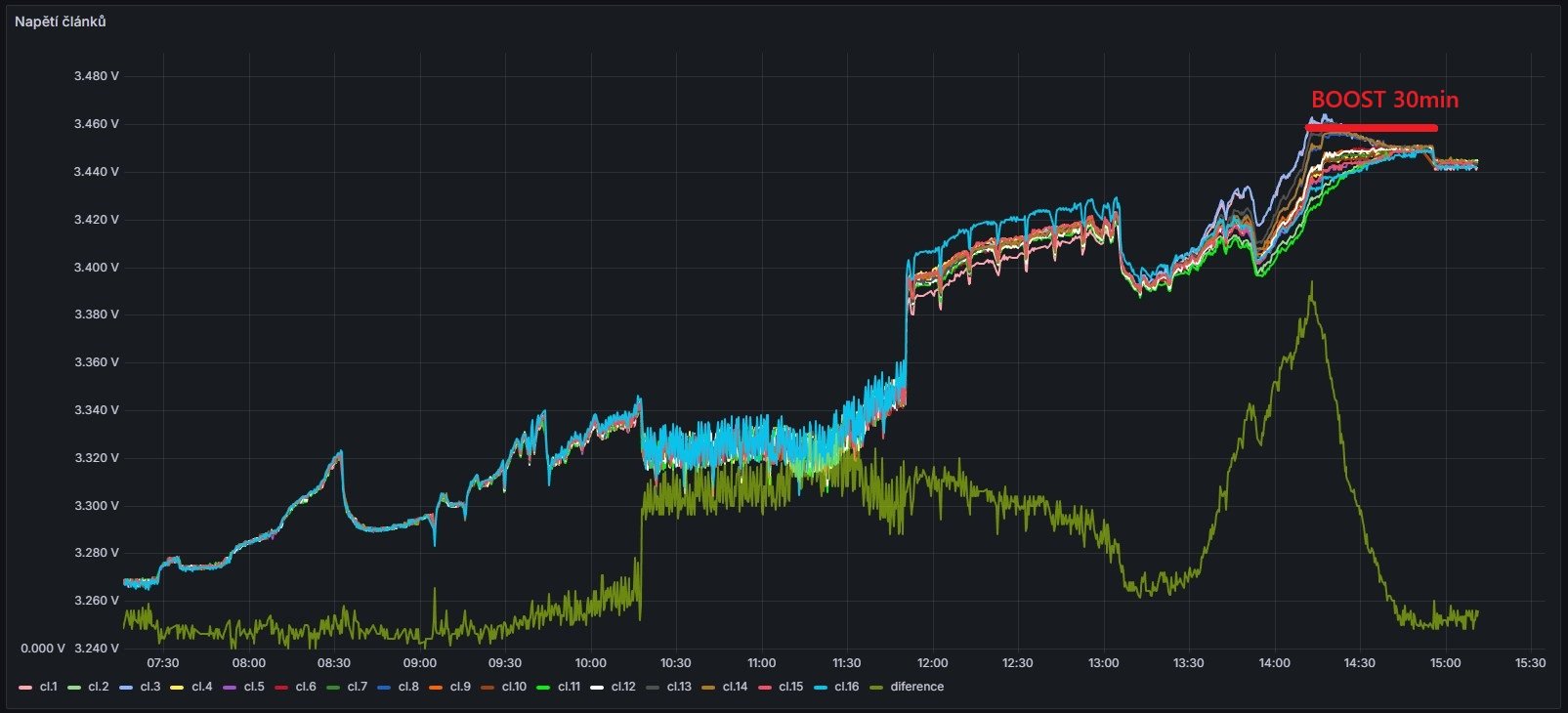 Dneska konečne dosáhlo napětí článků 3,43V a asi po dvou měsících proběhlo balancování článků, BMS - JK-PB2A16S20P v.15. Boost napětí 3,45V mám nastaveno na 30min. Nečekal jsem že po takové době bude stačit jedno balancování aby se články srovnaly
