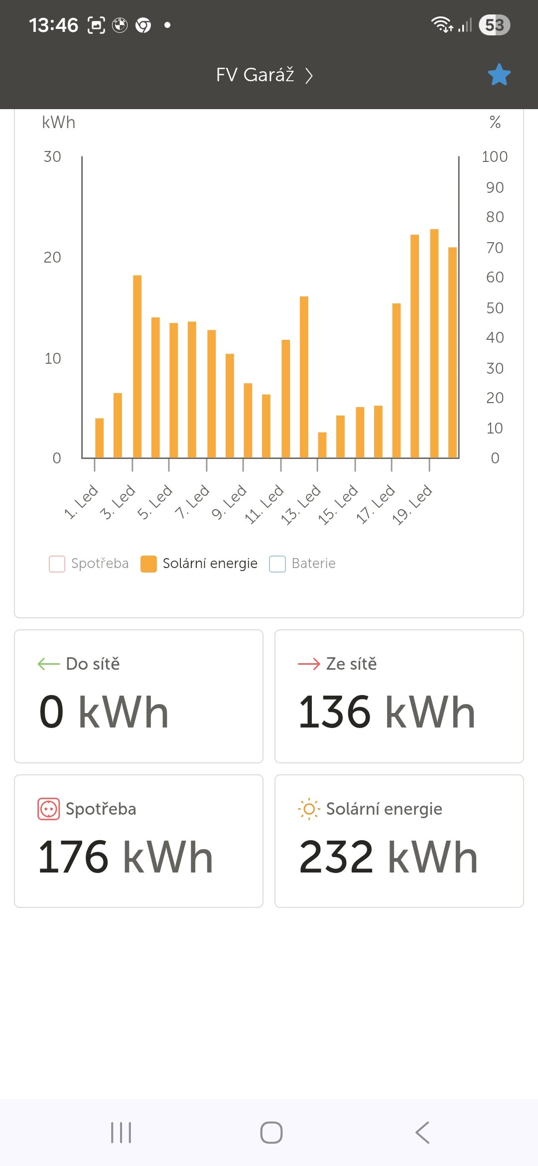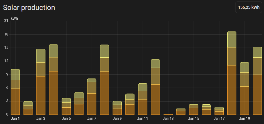 V lednu bych se cítil blbĕ.Denni výroba je 50-60kWh.+10kWh tepla.z trubic.Auto nabitý a dům vytápi TČ.od začátku měsíce mám výrobu cca 460kWh.