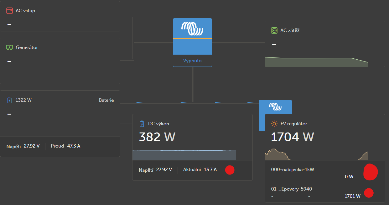 On dopočìtává proud a:nastavuje výkon všech nabìječú i ne Victron a:neznámé nabíječe zobrazuje v DC dlaždice