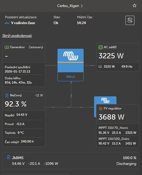 Panely 2S9P - 450Wp__8,1kWp JZ, Victron MP II 5kVA, SmartSolar 150/70, SmartSolar 150/100, Smartshunt, Cerbo, 16x280Ah +JK BMS.