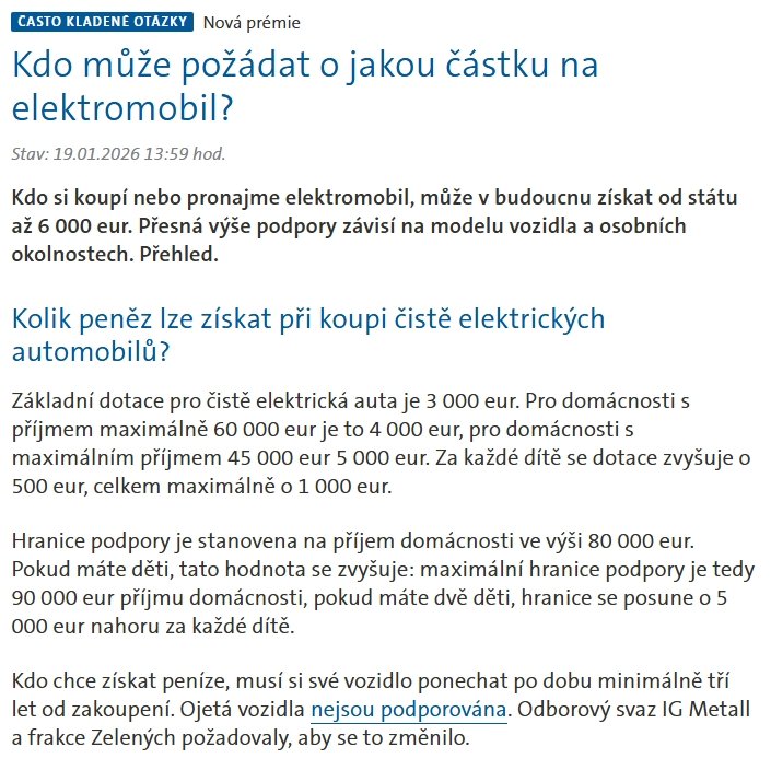 E-Auta v DE a nové dotace od 1.1.2026 - jsou zastropovaná cenou a mnoha dalšími faktory, myslím že i výkon a kapacita akku - žádná mohutná BMW to nyní nebudou - například - já nemám na dotaci šanci, ačkoliv se to týká - z první zkrácené verze zákona i malých soukromníků.
