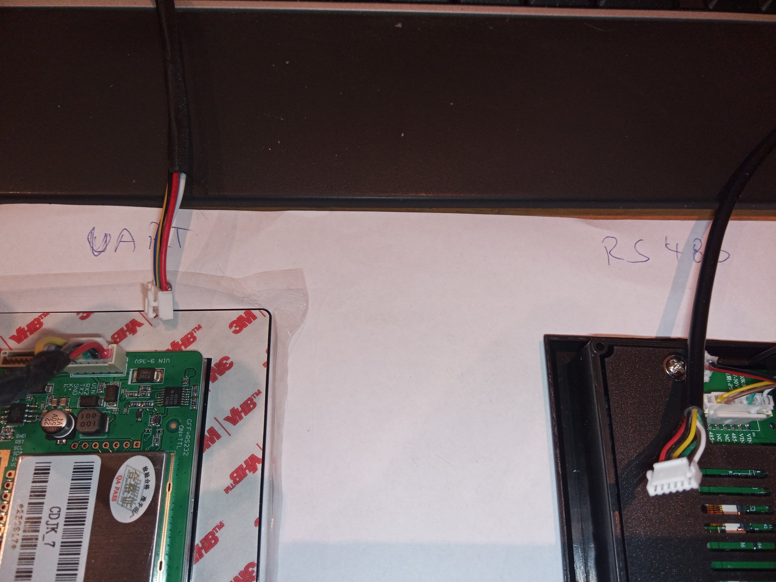 Dnes jsem složil jednu bednu s displejem dodaným k bedně, je to ten s plastovým rámečkem. Displej je zapojený přes dva mezikusy do miniaturního konektoru na desce s čínskými znaky. Google tvrdí, že ten rozsypaný čaj znamená displej. Displej ukazuje jenom tu jednu baterku. Položka pro další packy tam prostě není. Na destičce displeje jsou piny označené RS 485 + a -.