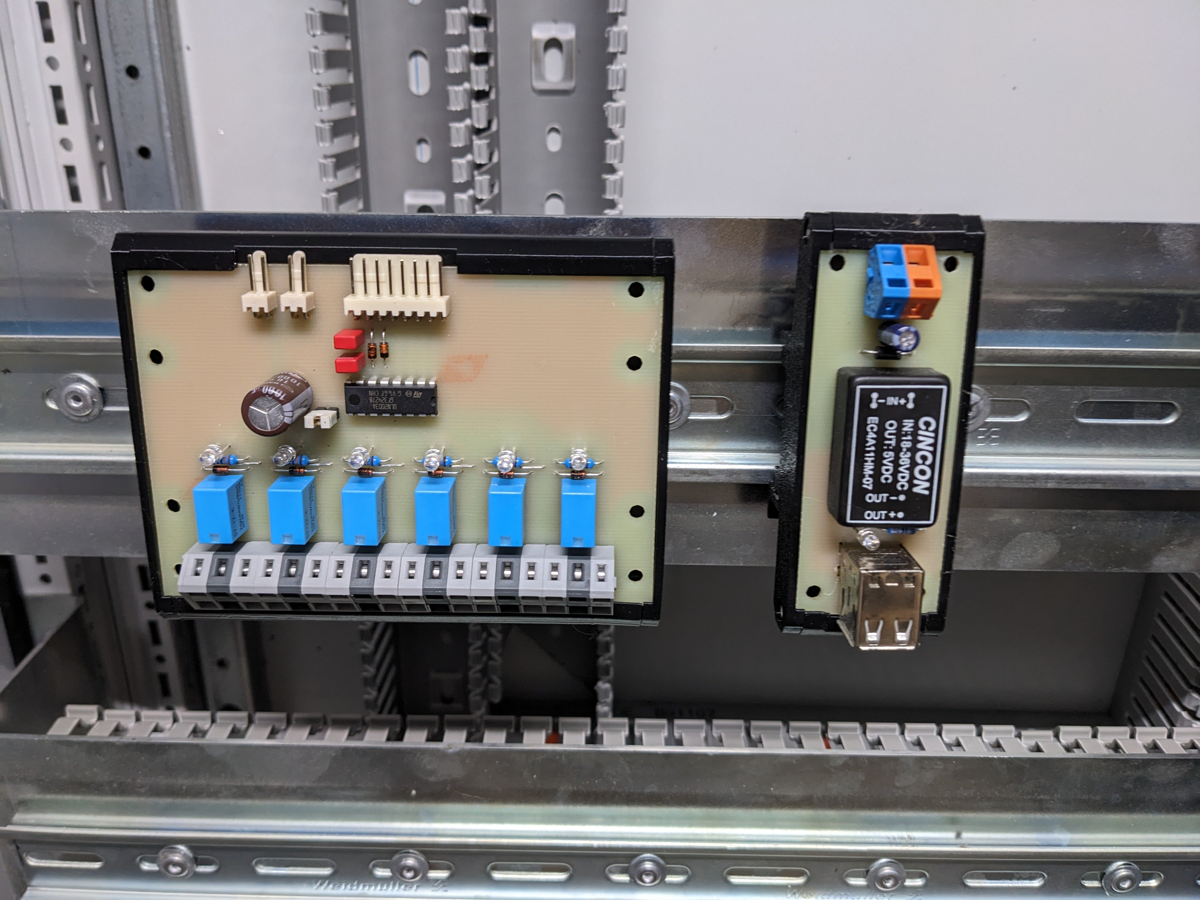 Dnes jsem to oříznul, vyzávitoval M3 a složil. 6 kanálový převodník z GX IO 150 na relé a USB izolovaný zdroj.