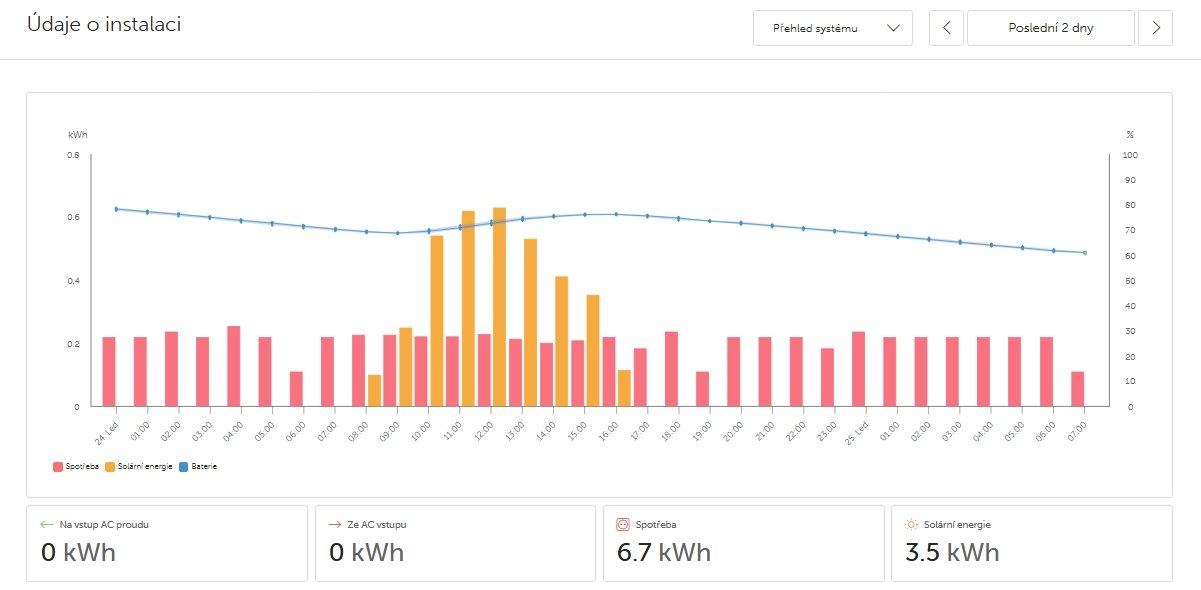 Výkon panelů po dvou po třech panelech je jasný - kvůli stínům sousedů - (to mám z vlákna o ohřevu vody) to je nyní vedlejší - další téma je ta baterie a Tvoje vlastní úvaha, kolik do toho chceš investovat = mělo by to být v nějakém poměru - protože to je složité a neekonomické mít 10kWp a k tomu baterku pouze 2,5kWh - která Ti pak nestačí ani na provoz systému a světla přes noc.