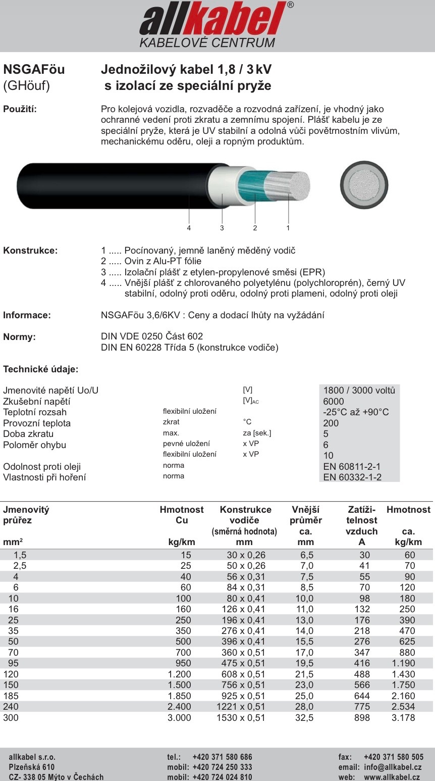 Kabel NSGAFÖU (1,8/3 kV) je vysoce ohebný jednožilový pryžový vodič navržený pro náročné podmínky s vysokou flexibilitou. Využívá jemně laněné měděné cínované jádro (třída 5 dle IEC 60228) a speciální plášť z polychloroprenu, což zajišťuje odolnost vůči olejům a opotřebení. Díky své konstrukci je ideální pro instalace v rozvaděčích, kolejových vozidlech a autobusech, a to i v prostorách vyžadujících častější ohyb.