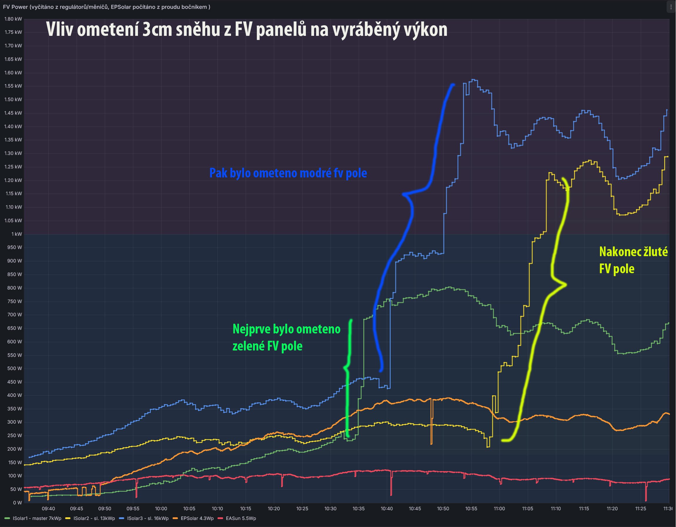 Na fv panely napadl nějaký sníh, tak jsem ho ometl. Sněží dál, ale teď to už stačí odtávat, takže fv panely zůstávají černé. Na grafu je vidět, jak vzrostl dodávaný výkon u jednotlivých fv polí, když jsem sníh ometl (je i vidět, že mi to zabralo necelou hodinu).
