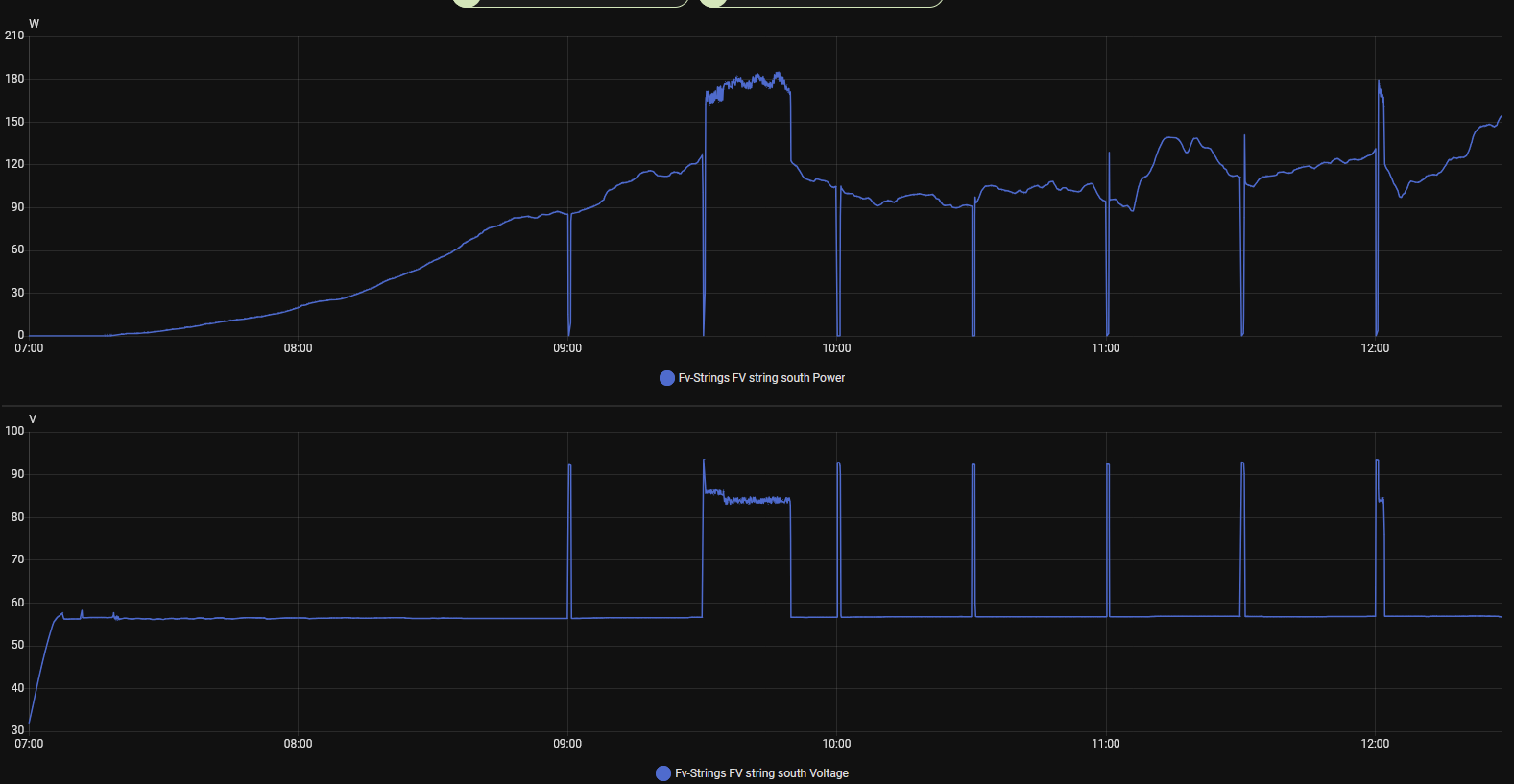 Toto viem následne automatizovane spúšťať podľa vybraných podmienok (Vmpp < 70V, výška slnka nad horizontom...) v nejakých intervaloch. Dalo by sa tam pridať aj osvetlenie v luxoch a ak sa zvýši, tak urobiť tento reštart. Len by som ten luminance senzor musel konečne zapojiť