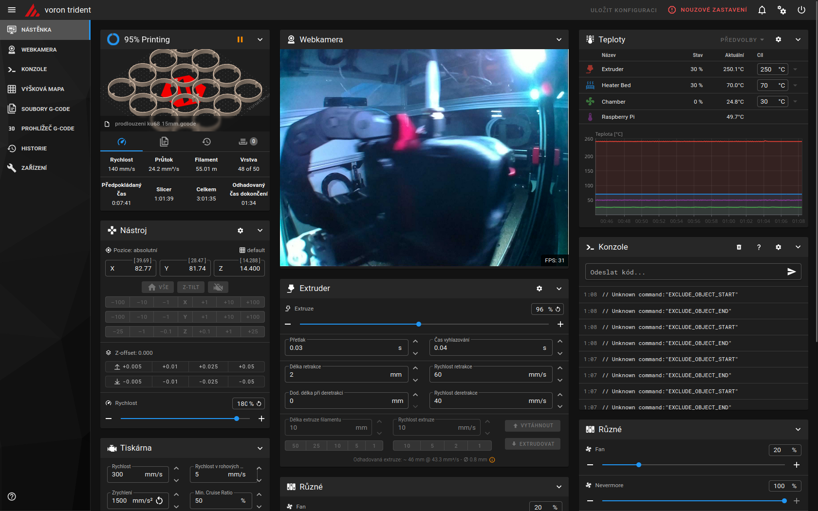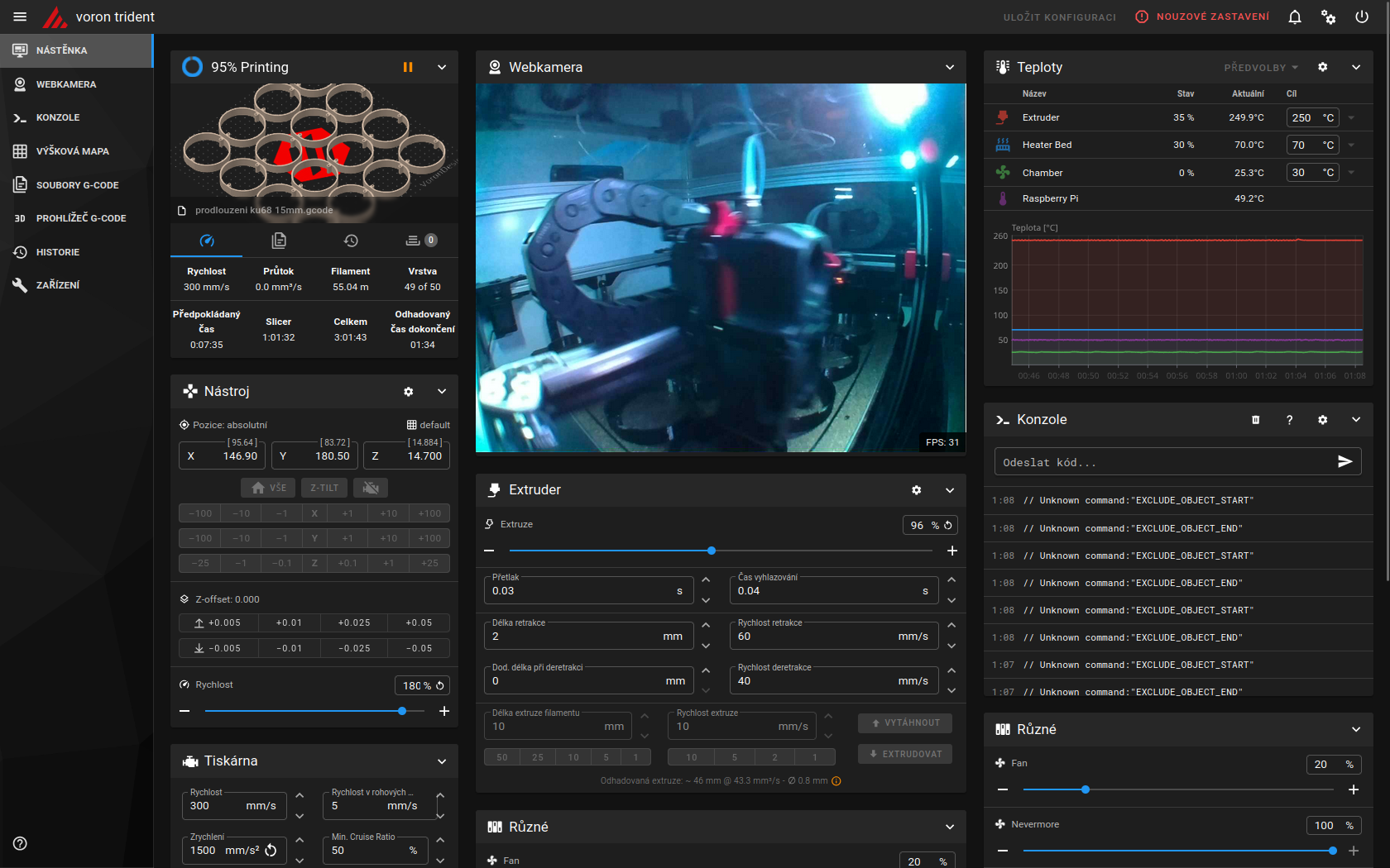 Jak je gcode nevím, ale mám limit 300mm/s a v tom informačním okně klipperu to je. zrovna jsem stačil stisknout prinscreen když to přejíždělo mezi dvěma objekty, a je tam i 300mm/s , mrkni, fakt sem to trefil, okem tam vidím obvykle tak 240. a průtok je na jiným prscr, namačkal jsem to tak nějak náhodně, sem tam vidím i víc. Jak píšu, boneničaspyčo
