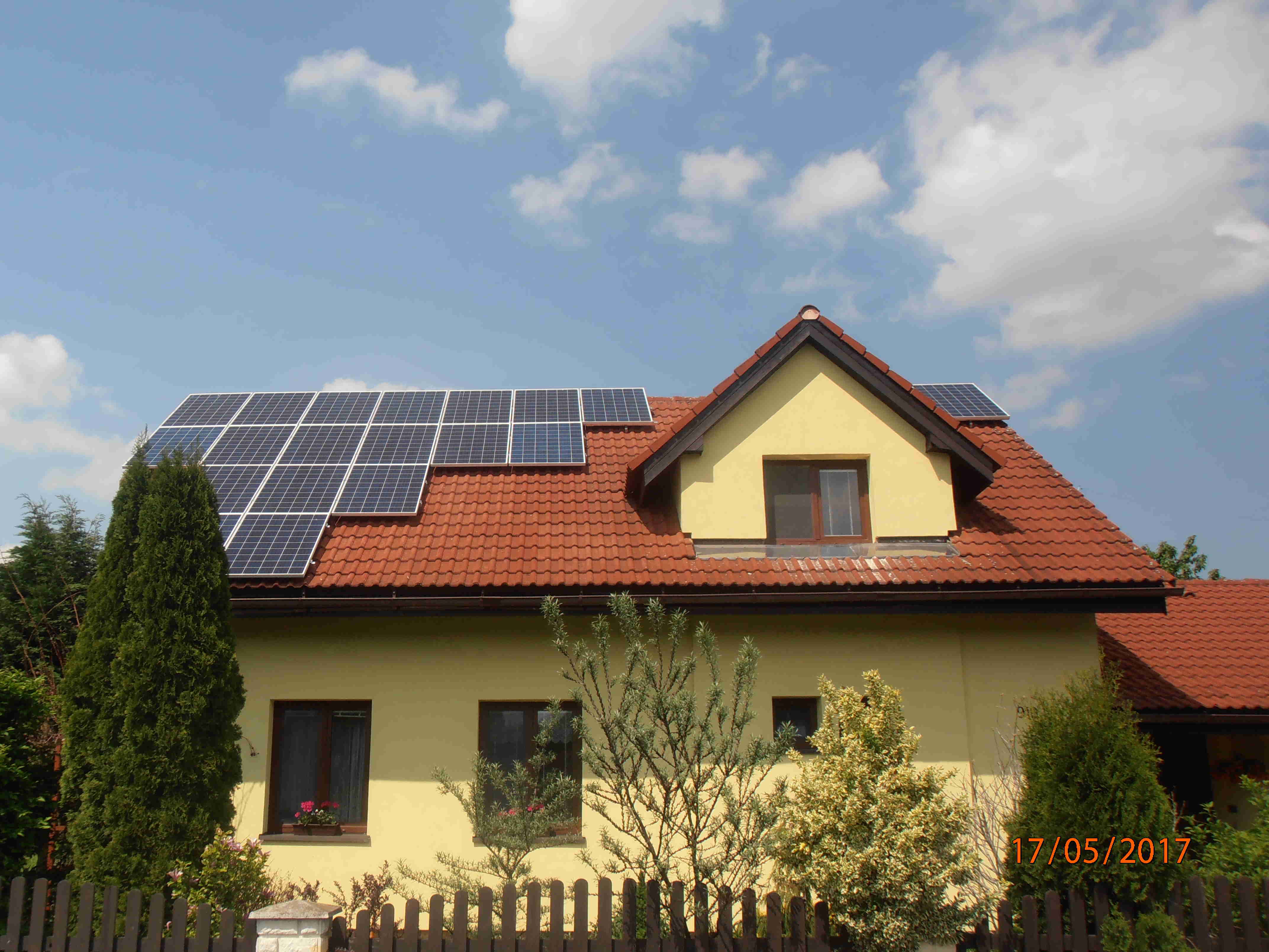 má větší výkon 5,4kW (20 panelů 270W) a lepší orientaci jen 4° odklonu od jihu na západ. Je bez regulace přebytků a akumulační nádrže. Přebytek energie je dodáván (prodáván) do distribuční sítě za smluvní cenu s vykupujícím obchodníkem.