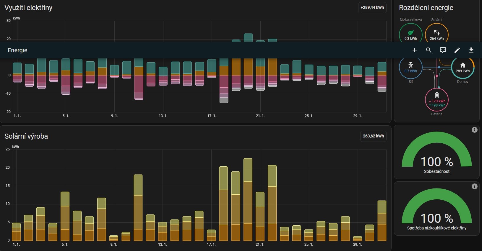Nicméně se mi podařilo v lednu zachovat plnou soběstačnost. Napomohly k tomu přidané baterky od kamaráda, který nebyl spokojený se starými 200Ah WINSTONY, tak mi je věnoval. Mám nyní tedy dobrou zásobu na špatné časy, které právě panují.