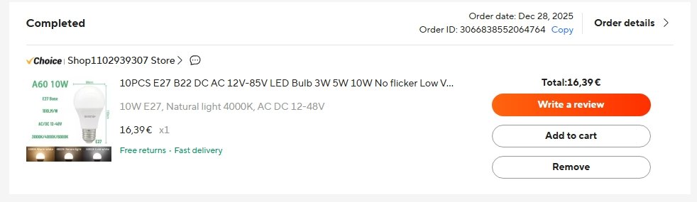 I tak si ale já osobně dám žárovky, které zvládají energii DC48V - vzhledem k tomu, že cena je stejná - proč to honit přes měnič, když mám stejný napětí celoročně v baterii... a zapojené samostatné do SV okruhů mám od počátku