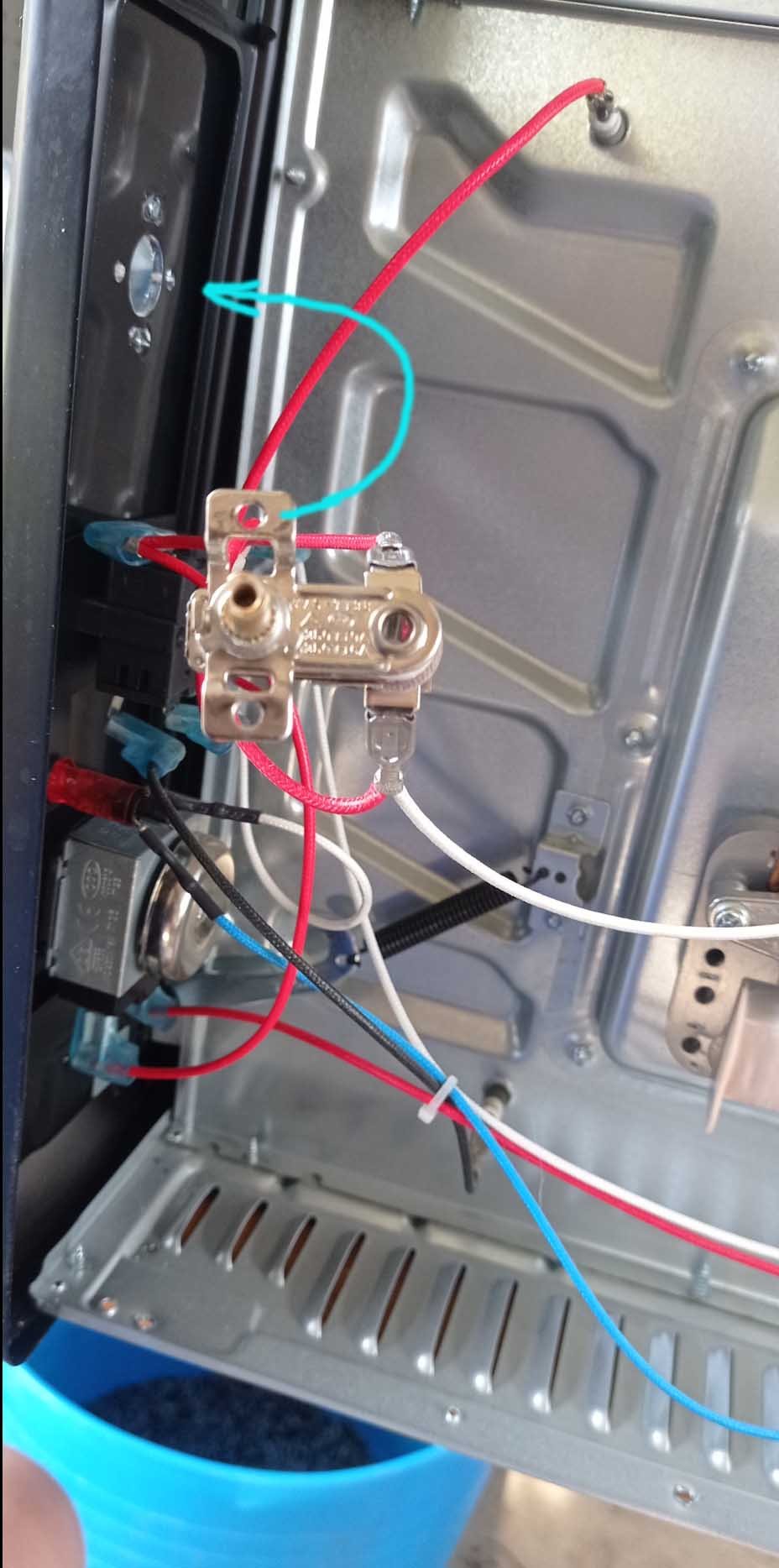 Ten jednoduchý "termostat" je v těch malých stolních troubách a není umístěn uvnitř trouby. Jeho funkce je taková, že proud prochází bimetalem a ten se tím ohřeje a rozpojí obvod. Nastavovací kolečko tedy funguje jen tak, že když točím jedním směrem bude obvod déle uzavřen. Tady mám jeden před výměnou vyšroubovaný z čelní desky troubičky.