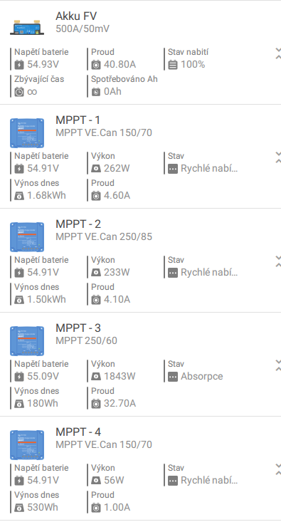 Tak zkus ty 3ks MPPT datově odpojit nastavit jim stejné hodnoty a nechat jen jeden do Cerba, aby jsi měl přehled a nastavit ABS třeba 1hod, jen tak na zkoušku jestli proběhne Absorbce.