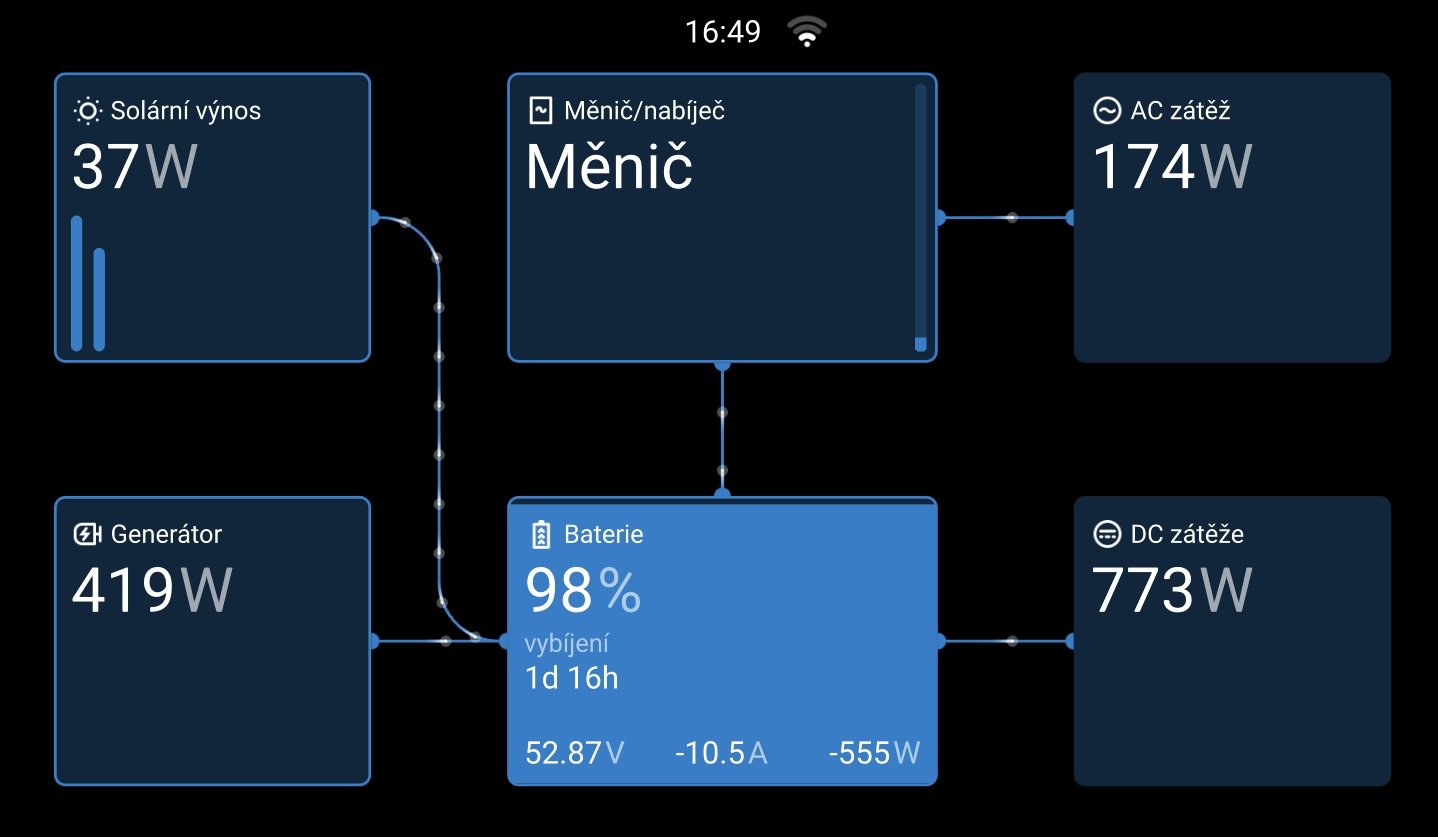 Teď to vypadá (opět) že vše funguje správně. U toho i test ,,zesláblé baterky" a automatický start malé nabíječky.... v pozici generátor přes přebytečný Shunt 300A